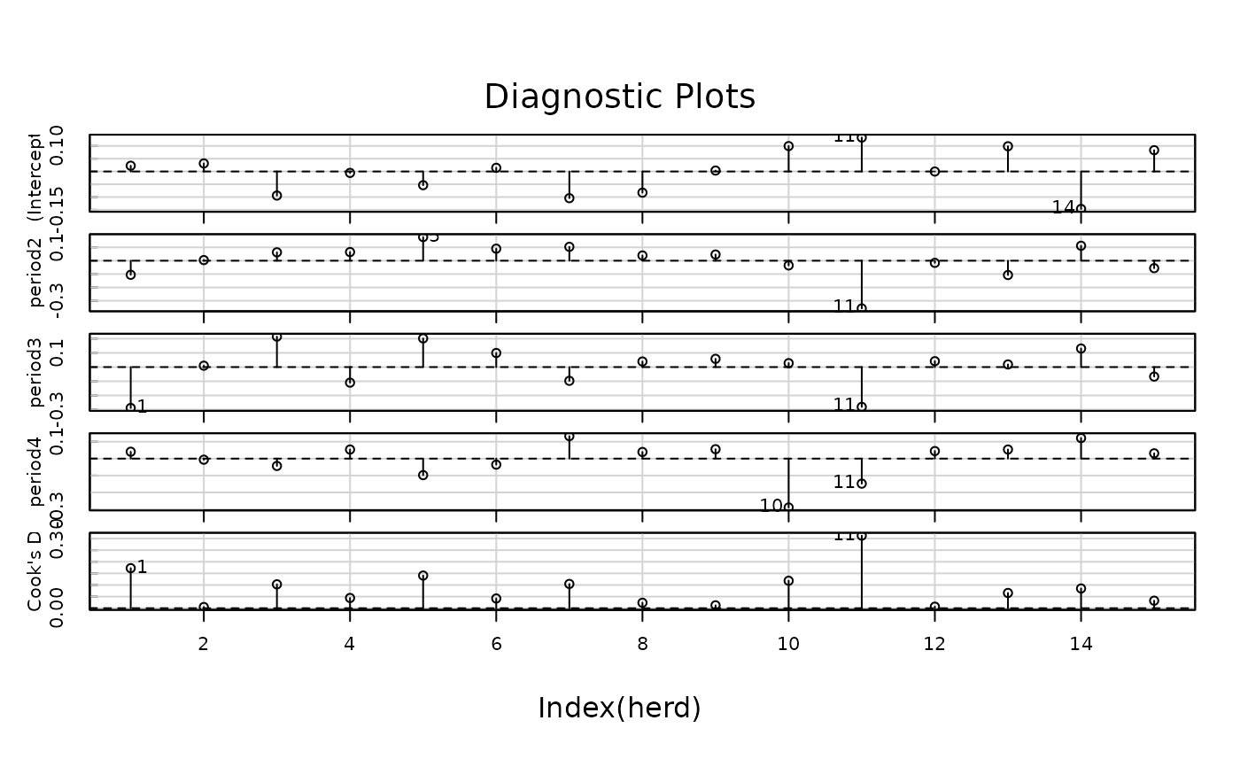 gm1.11 <- update(gm1, subset = herd != 11) # check deleting herd 11