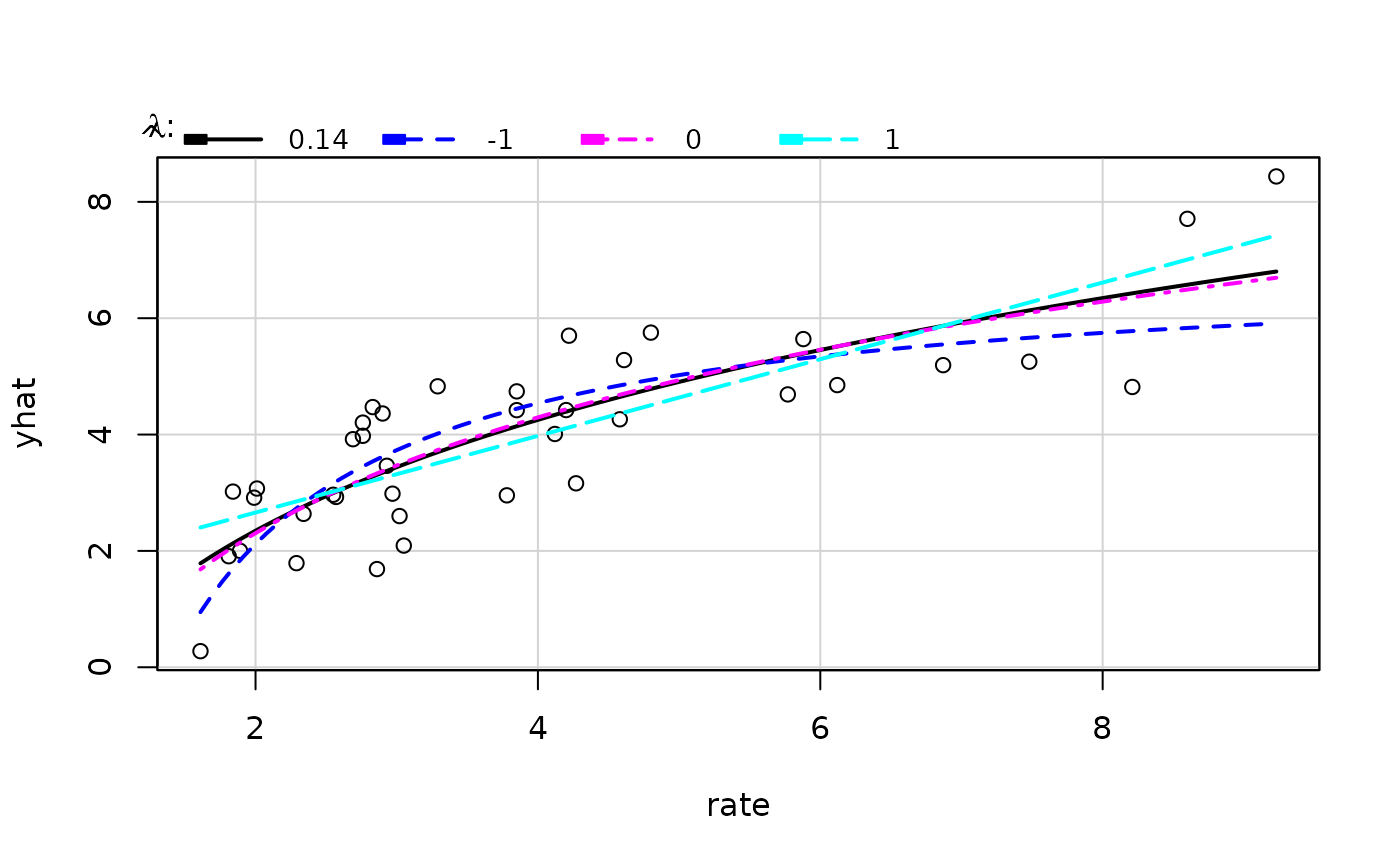 As a side effect, a plot is produced with the response on the horizontal axis and fitted values on the vertical axis. Several lines are added to be plot as the ols estimates of the regression of \(\hat{Y}\) on \(Y^{\lambda}\), interpreting \(\lambda\) = 0 to be natural logarithms.