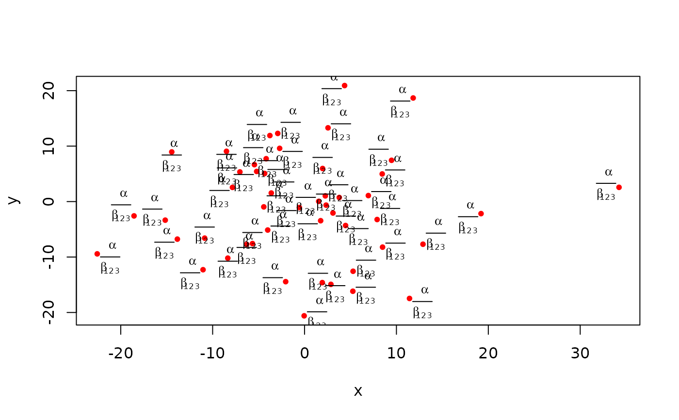 pointLabel(x, y, expression(over(alpha, beta[123])), offset = 0, cex = .8)