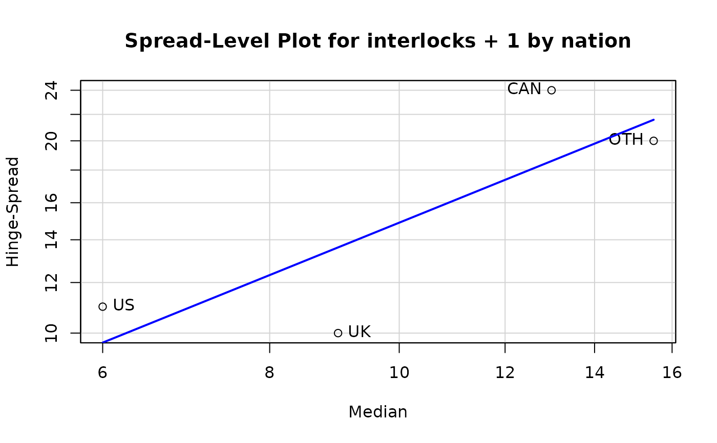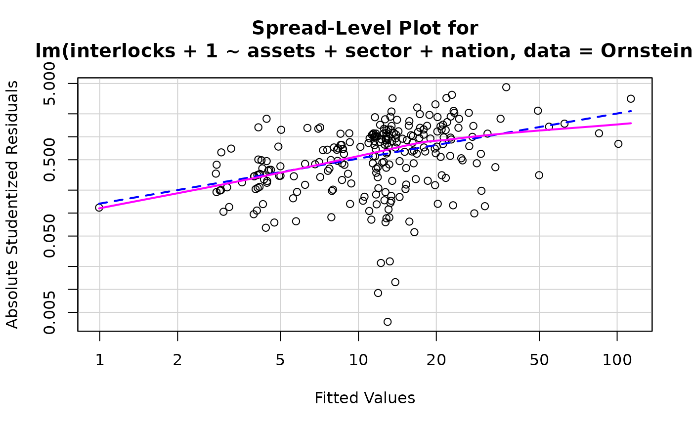 spreadLevelPlot.RdCreates plots for examining the possible dependence of spread on level, or an extension of these plots to the studentized residuals from linear models.