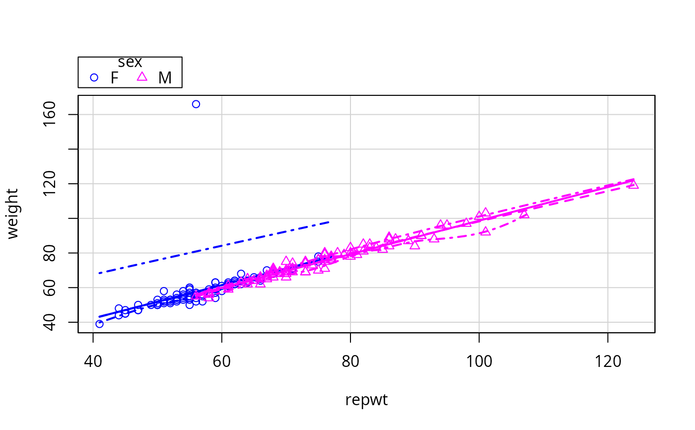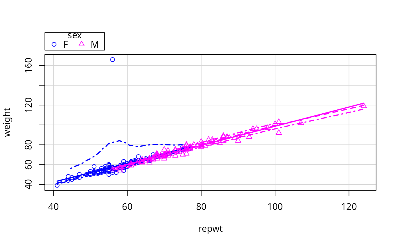 scatterplot(weight ~ repwt | sex, data=Davis,
