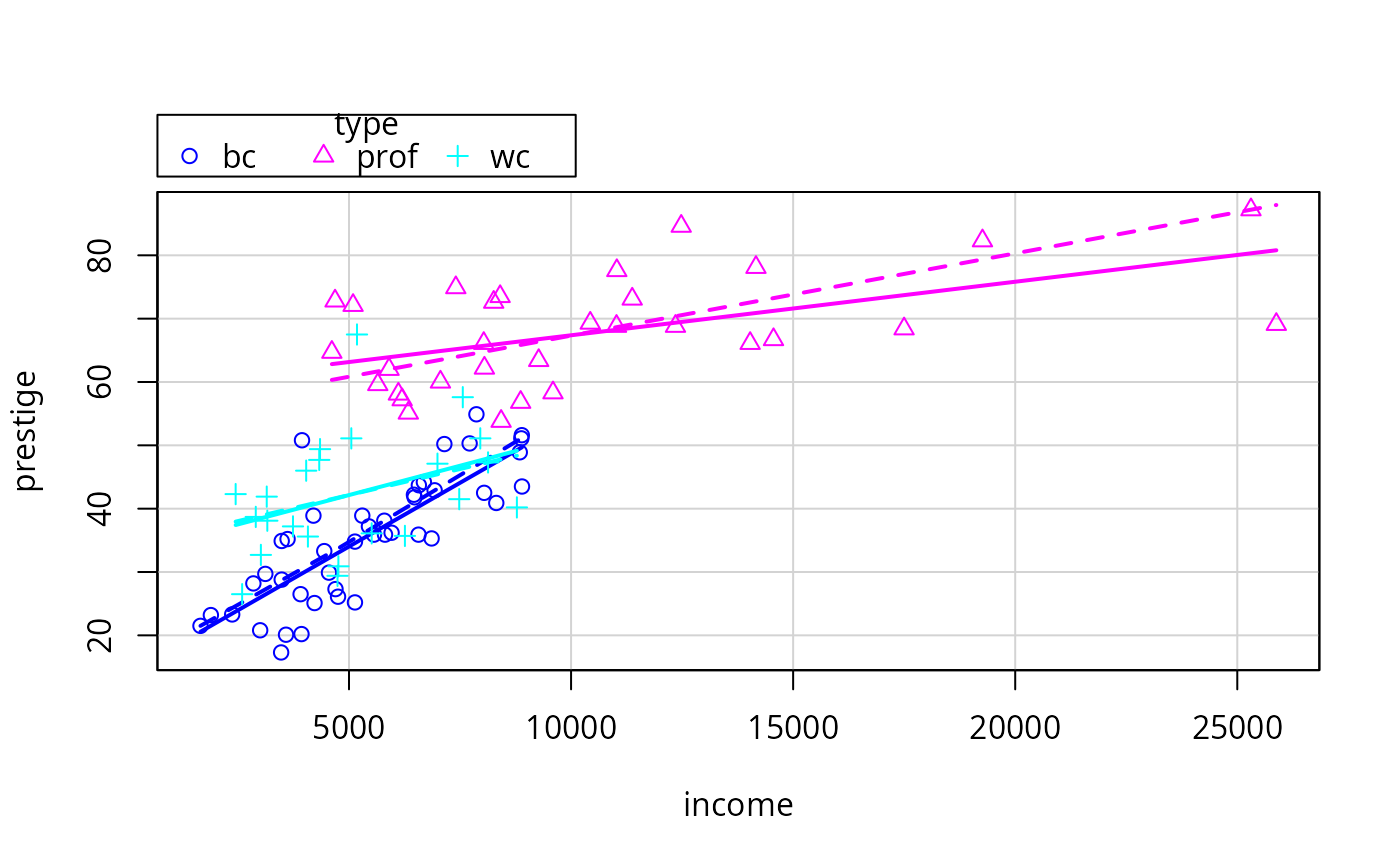 scatterplot(prestige ~ income | type, data=Prestige, smooth=FALSE)