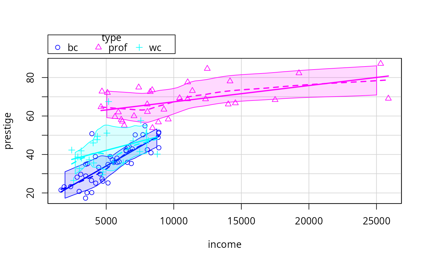 additional arguments to the smoother. As of November, 2016, the smoother is evaluated by default at an equally spaced grid of 50 points in the range of the horizontal variable. With any of the smoothers, you can change to, say, 100 evaluation points via the argument smoother.args=list(evaluation=100). As of version 3.0-1, the smoother.args elements col.var, lty.var, and lwd.var are equivalent to col.spread, lty.spread, and lwd.spread, respectively. The style sub-argument controls how spread/variance envelopes are displayed, with choices "filled" (the default), "lines", and "none" (which is equivalent to var=FALSE). The alpha subargument controls the transparency/opacity of filled spread envelopes with allowable values between 0 and 1 (default 0.15). The border subargument controls whether a border line is drawn around the filled region (the default is TRUE). The vertical subargument controls whether the left and right ends of the filled region are forced to be vertical (the default is TRUE).