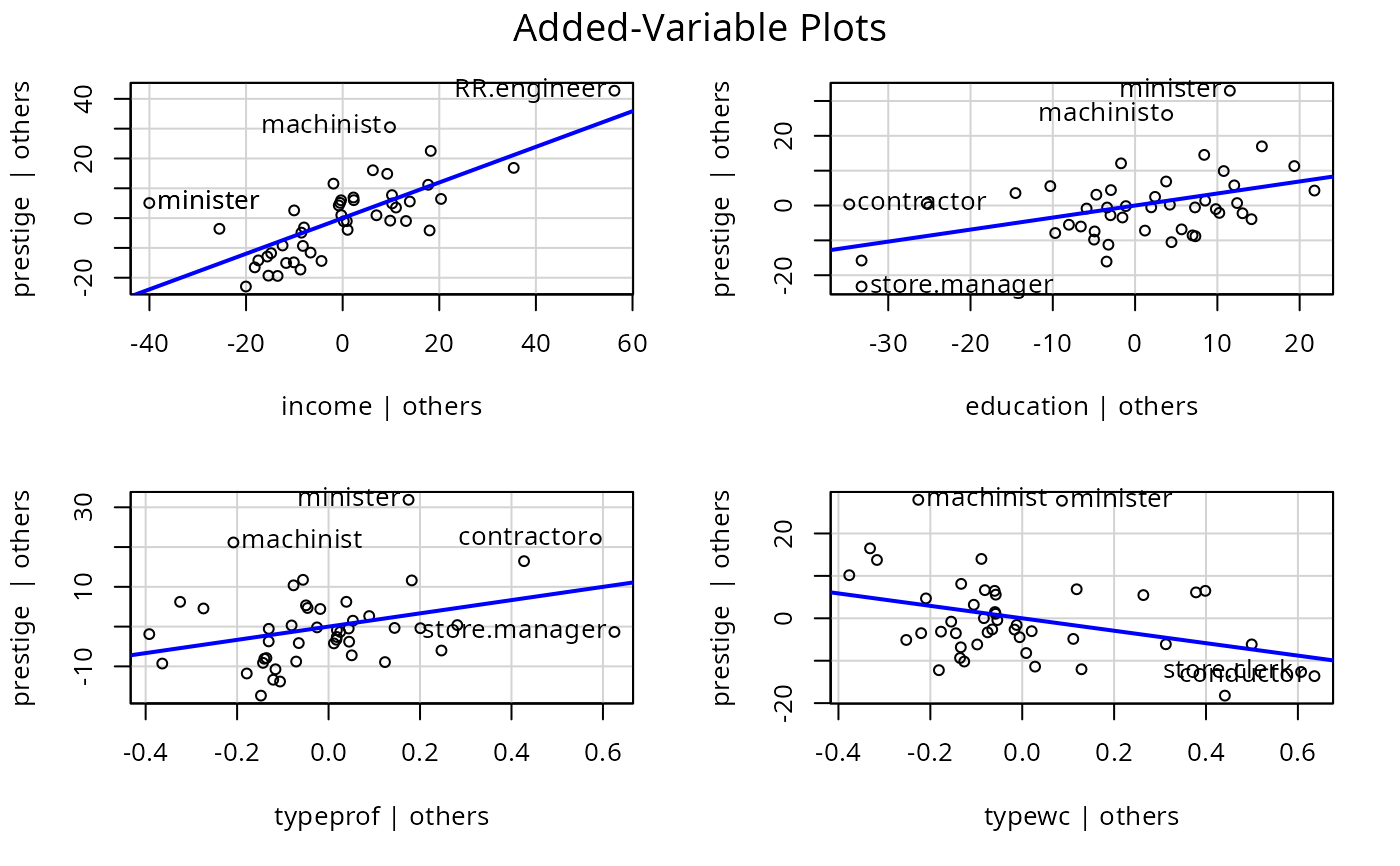 avPlots.RdThese functions construct added-variable, also called partial-regression, plots for linear and generalized linear models.