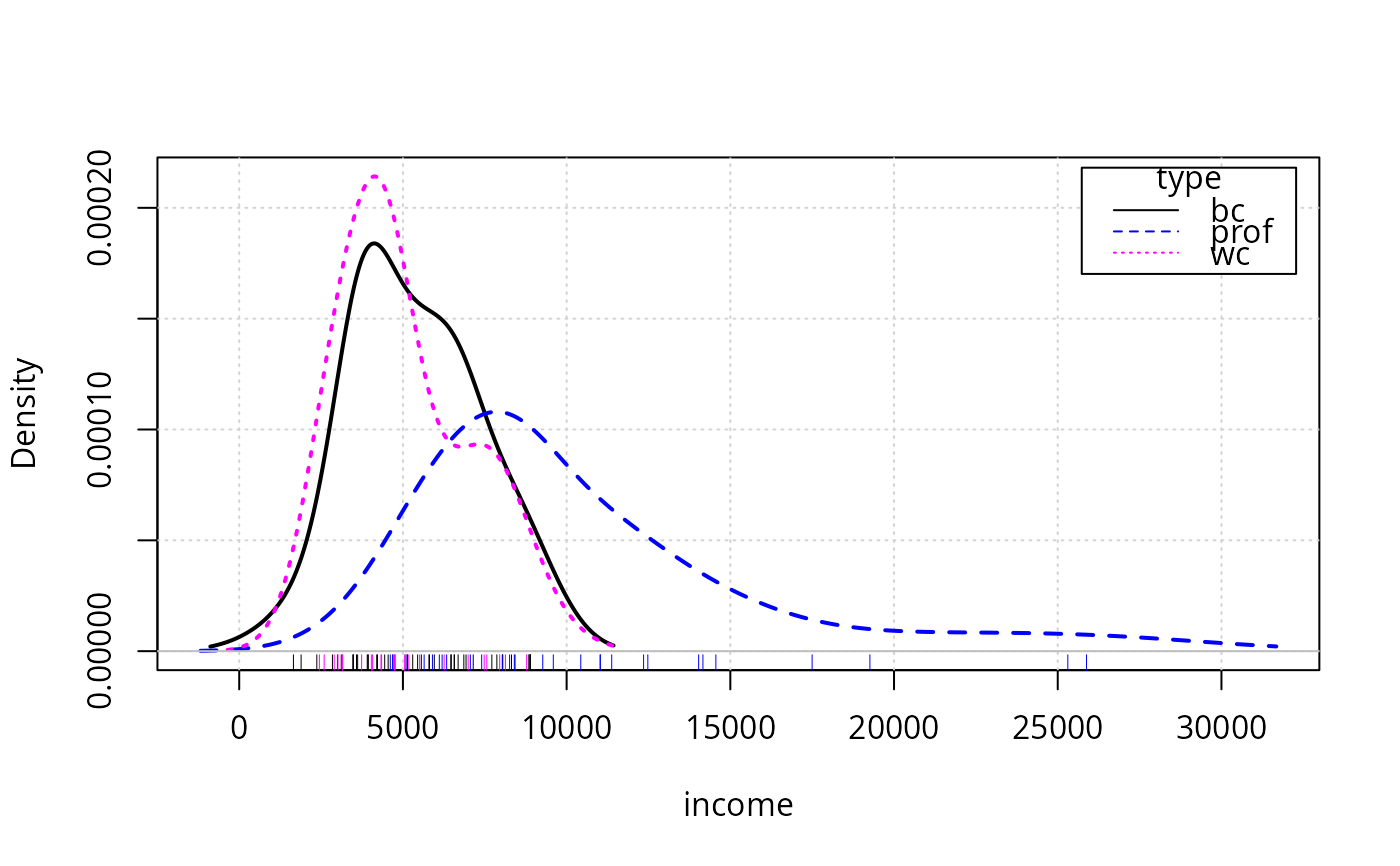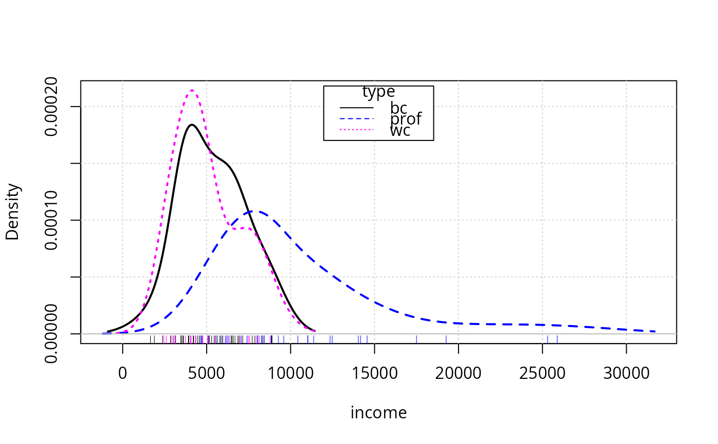 densityPlot(income ~ type, kernel=depan, legend=list(location="top"), data=Prestige)
