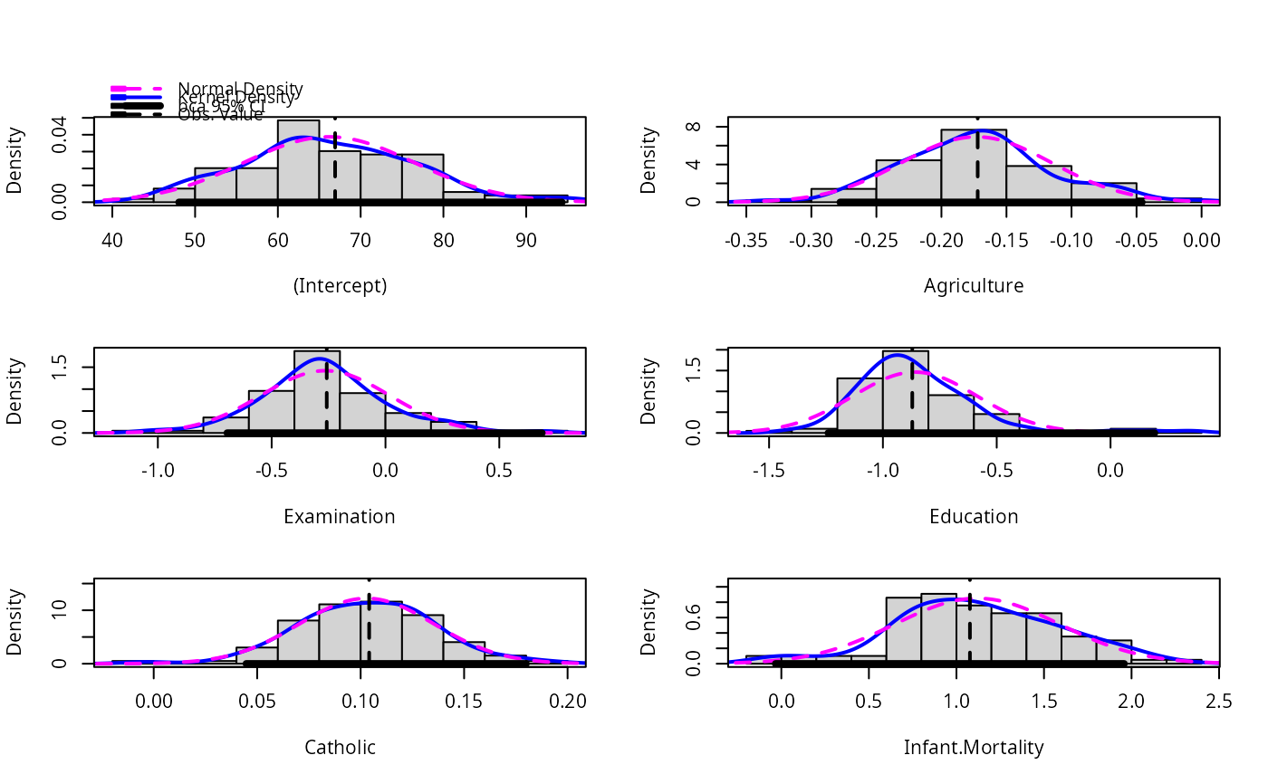 A vector of numbers or coefficient names giving the coefficients for which a histogram or confidence interval is desired. If numbers are used, 1 corresponds to the intercept, if any. The default is all coefficients.