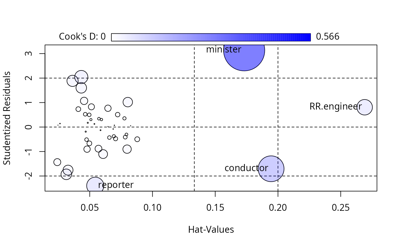 influencePlot.RdThis function creates a “bubble” plot of Studentized residuals versus hat values, with the areas of the circles representing the observations proportional to the value Cook's distance. Vertical reference lines are drawn at twice and three times the average hat value, horizontal reference lines at -2, 0, and 2 on the Studentized-residual scale.