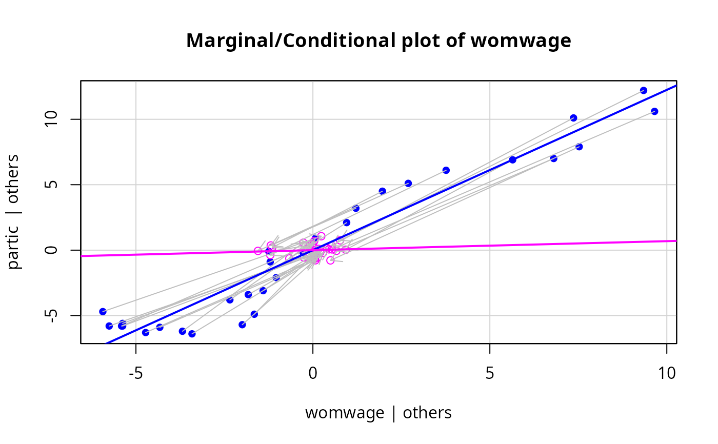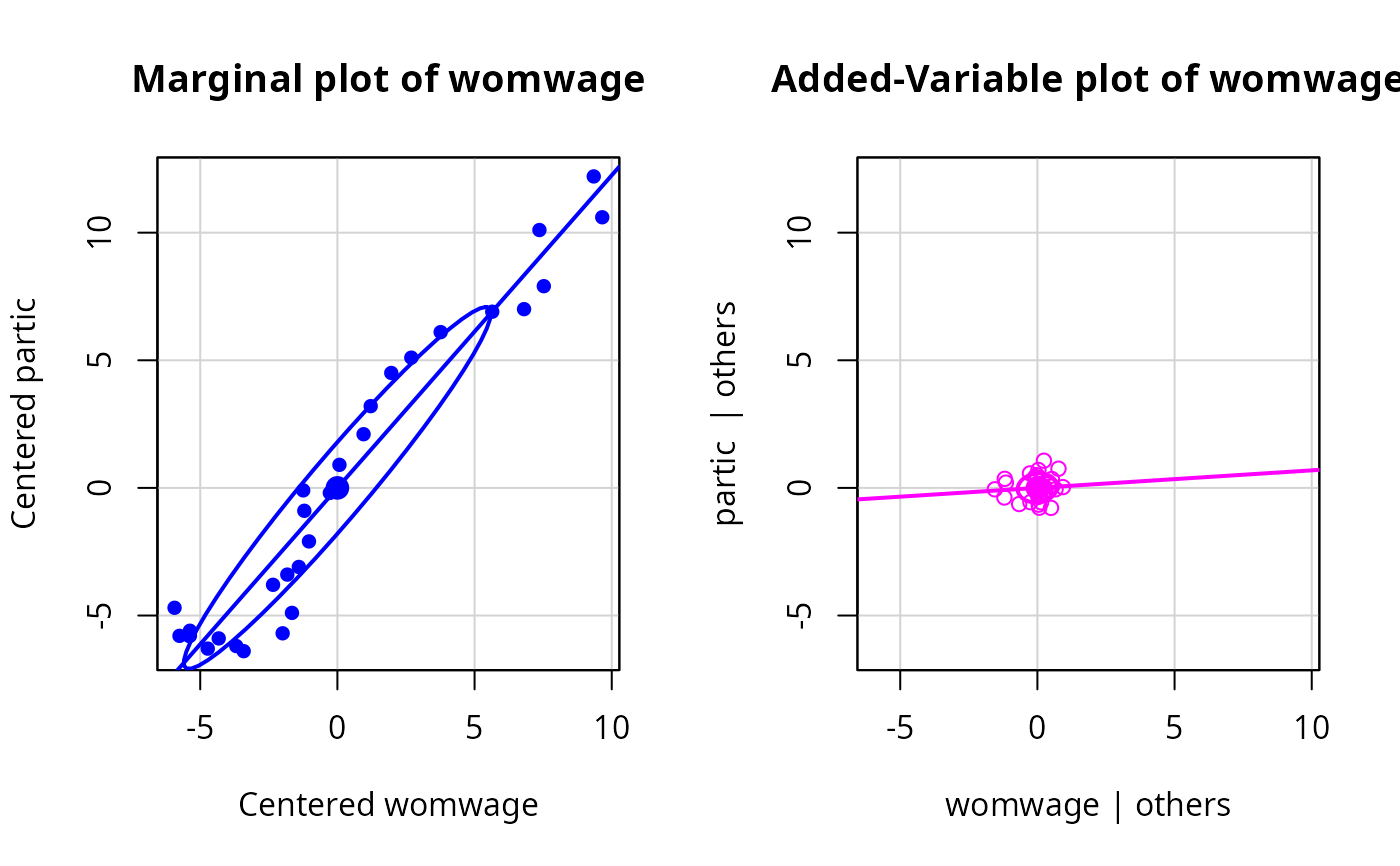 With an lm object, suppose the response is Y, X is a numeric regressor of interest, and Z is all the remaining predictors, possibly including interactions and factors. This function produces two graphs. The first graph is the marginal plot of Y versus X, with each variable centered around its mean. The second conditional plot is the added-variable plot of e(Y|Z) versus e(X|Z) where e(a|b) means the Pearson residuals from the regression of a on b. If overlaid=TRUE, these two plots are overlaid in one graph, with the points in different colors. In addition, each point in the marginal plot is joined to its value in the conditional plot by an arrow. Least squares regression lines fit to the marginal and conditional graphs are also shown; data ellipsoids can also be added. If overlaid=FALSE, then the two graphs are shown in side-by-side plots as long as the second argument to layout is equal to 2, or layout is set by the function. The arrows are omitted if the graphs are not overlaid.