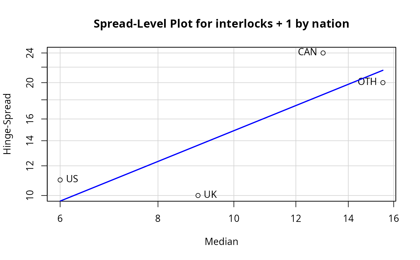 spreadLevelPlot(interlocks + 1 ~ nation, data=Ornstein)