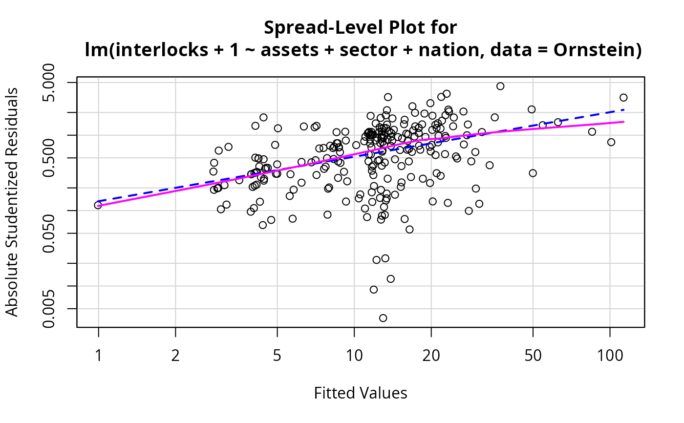 spreadLevelPlot.RdCreates plots for examining the possible dependence of spread on level, or an extension of these plots to the studentized residuals from linear models.