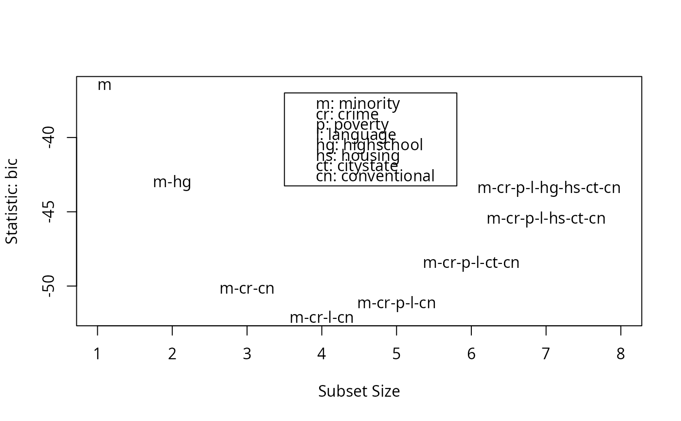 statistic=c("bic", "cp", "adjr2", "rsq", "rss"),