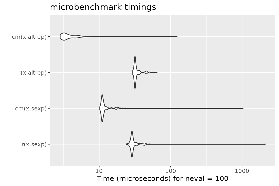 mb = microbenchmark(r(x.sexp), cm(x.sexp), r(x.altrep), cm(x.altrep))