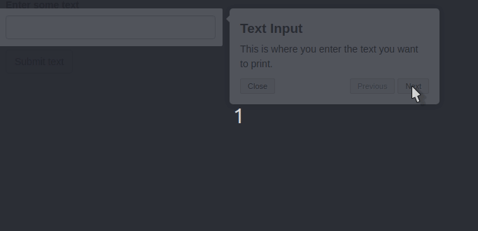 shinyApp(ui, server)Now we can create a guide to walk the user through the application: simply initialise a new guide from the Cicerone object then add steps.
