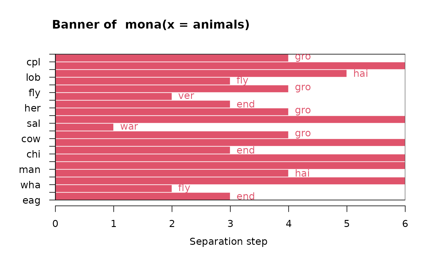 #> mona(x, ..) fit; x of dimension 20x6