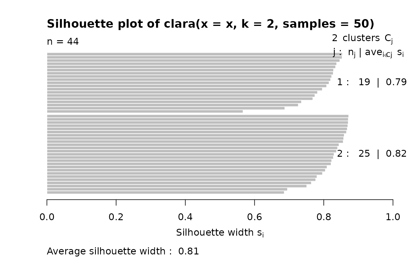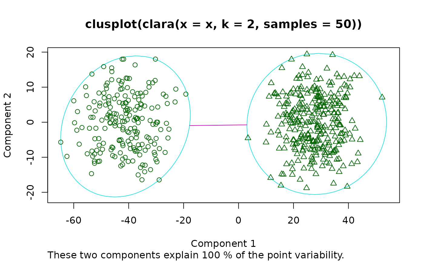 #> Call: clara(x = x, k = 2, samples = 50)