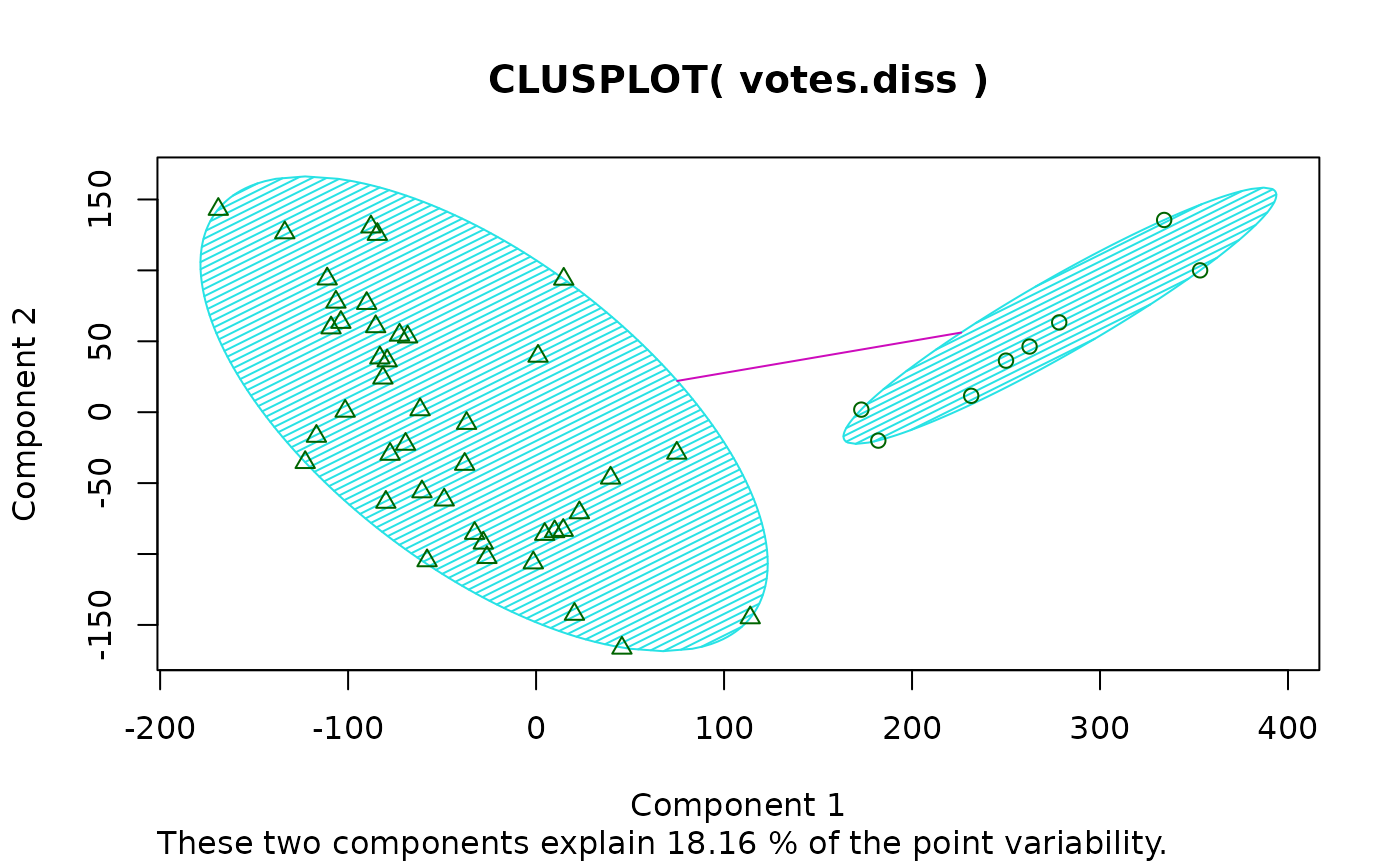 clusplot(votes.diss, votes.clus, diss = TRUE, shade = TRUE)