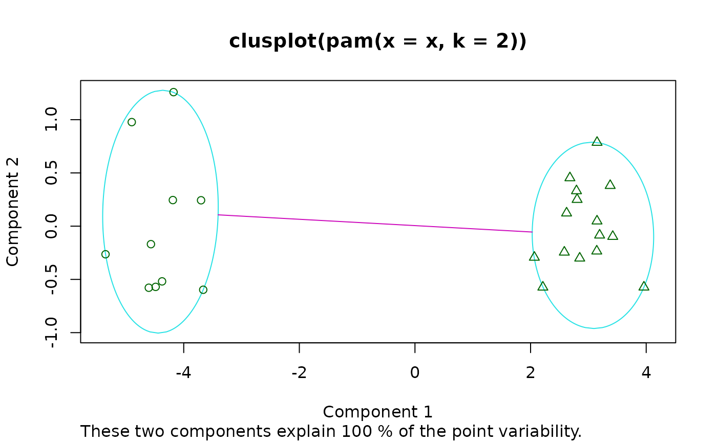 clusplot(x, main = NULL, dist = NULL, ...)an R object, here, specifically an object of class