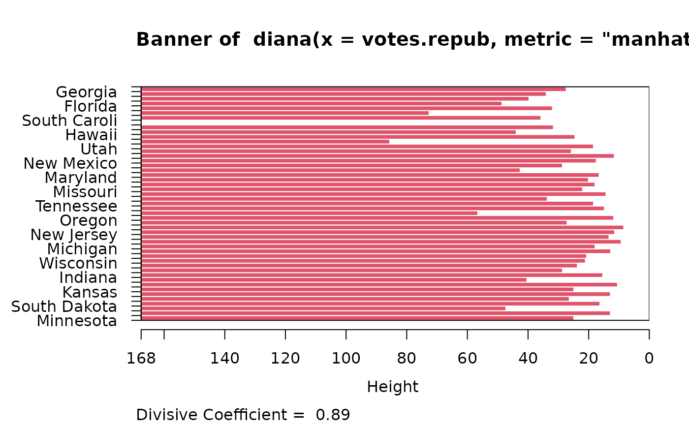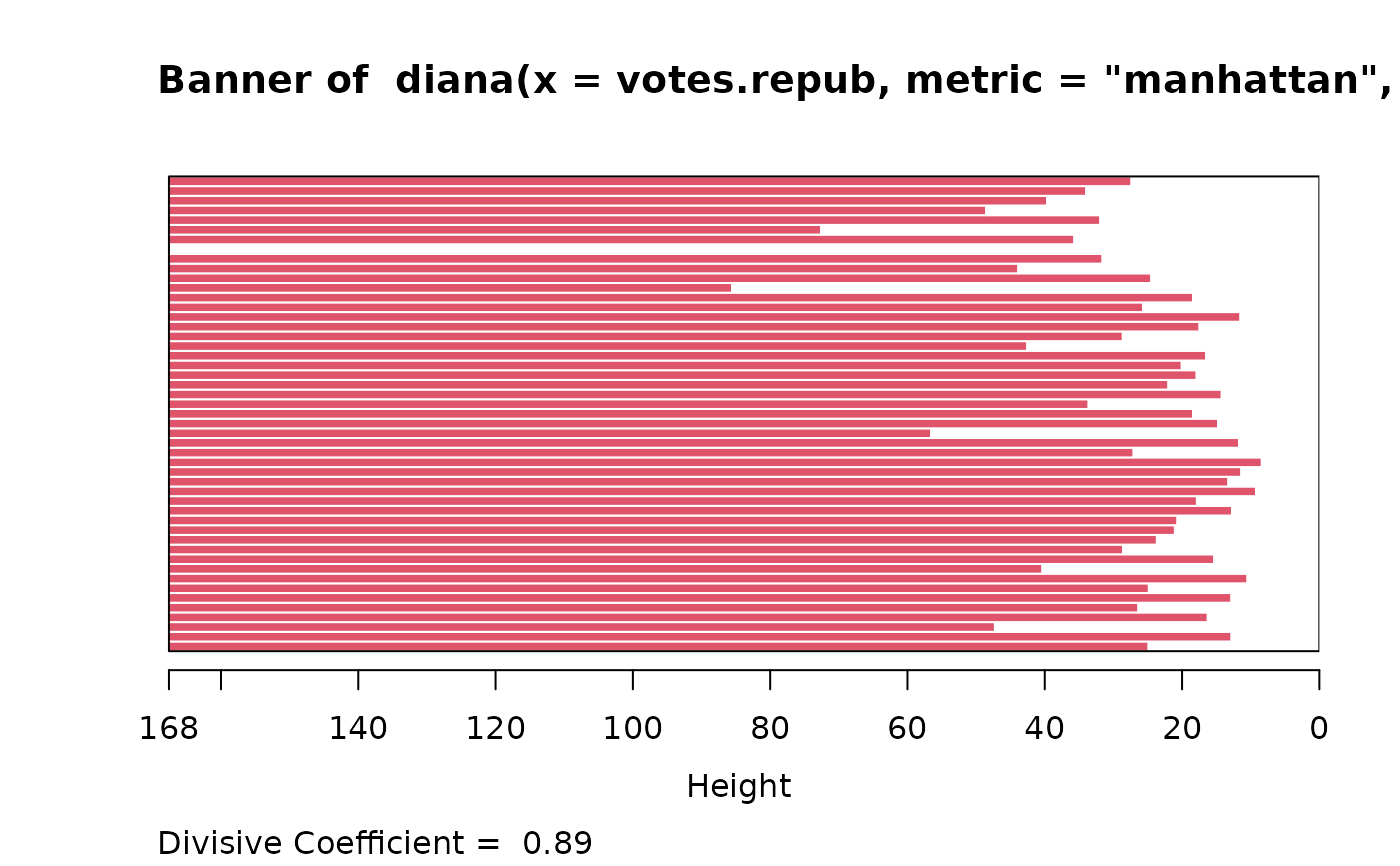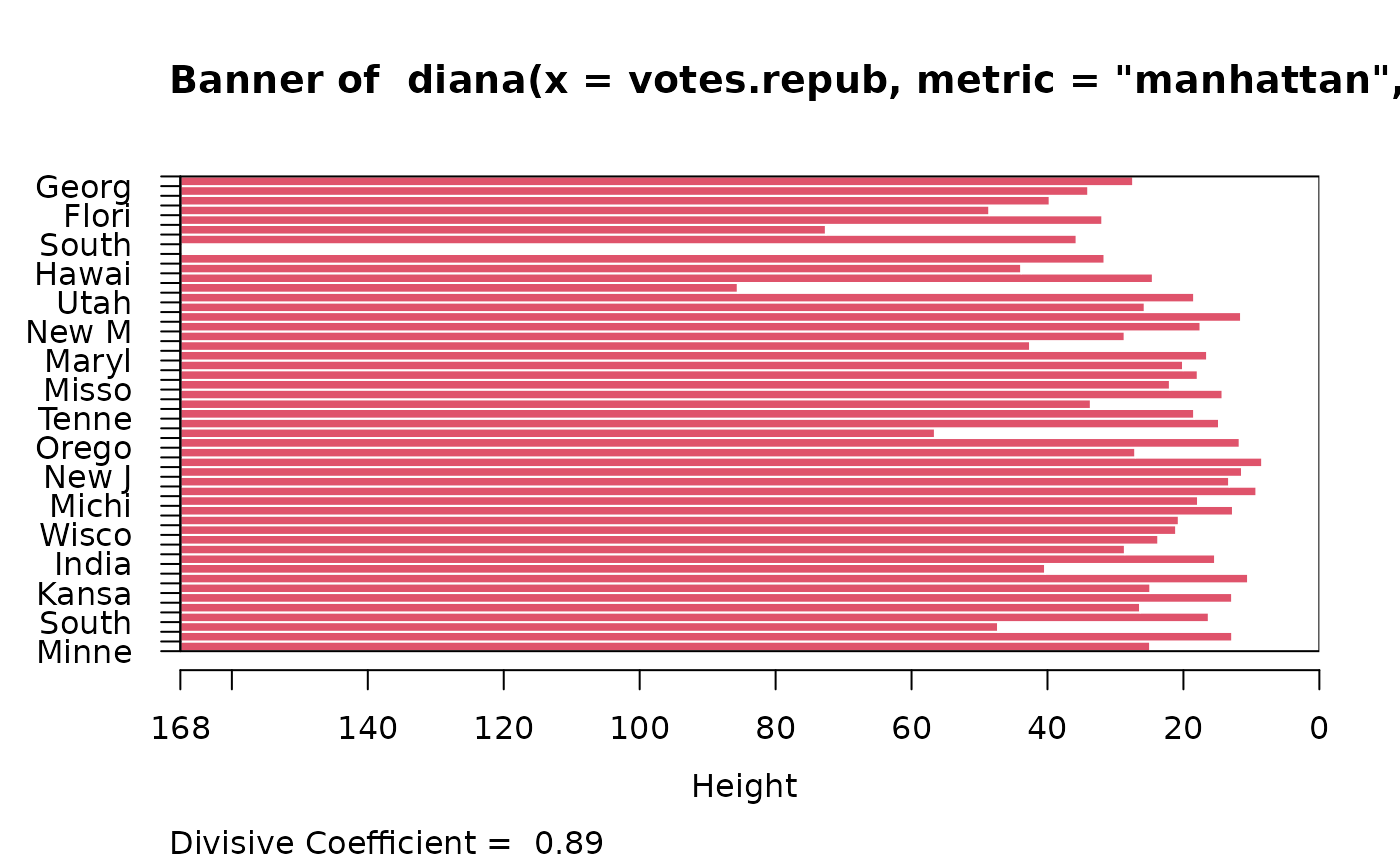 #> diana> dv <- diana(votes.repub, metric = "manhattan", stand = TRUE)