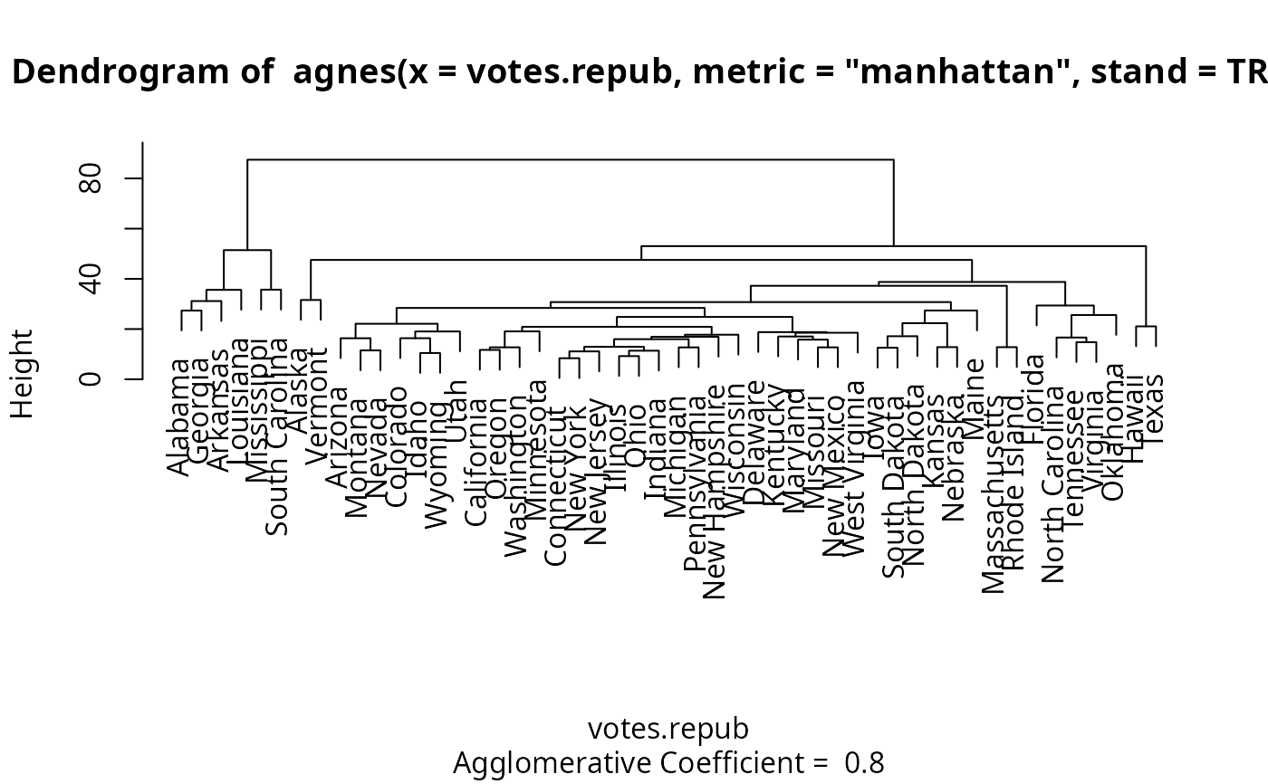 agnes(x, diss = inherits(x, "dist"), metric = "euclidean",