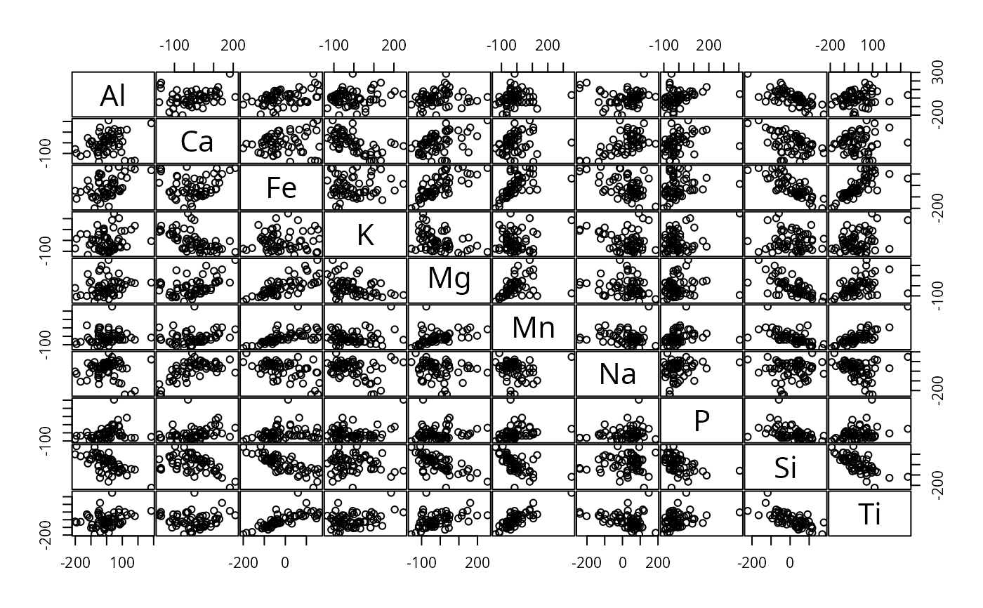 A data frame with 61 observations on 10 variables. The variables contain scaled concentrations of chemical elements.