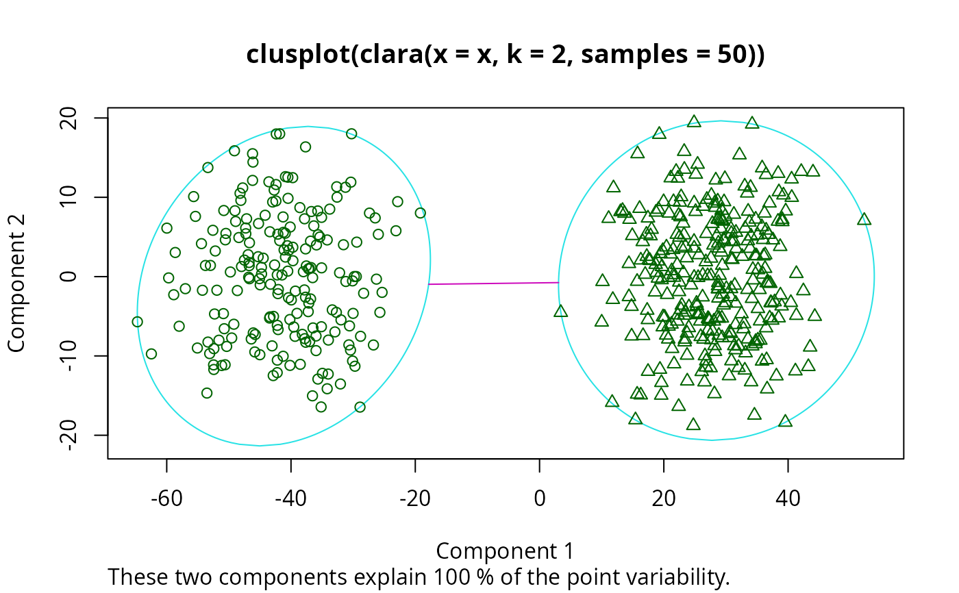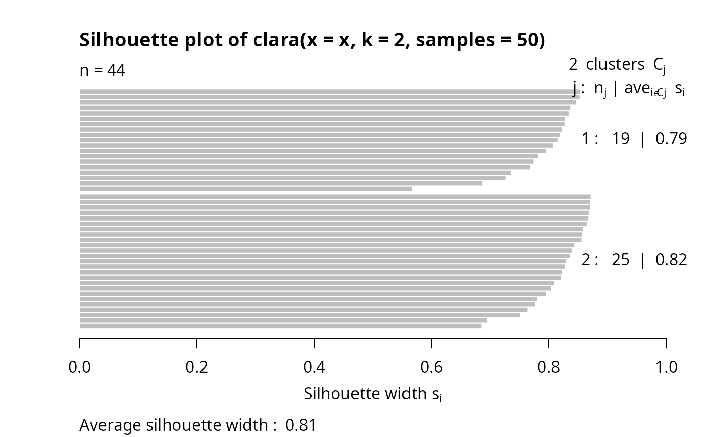 #> Call: clara(x = x, k = 2, samples = 50)