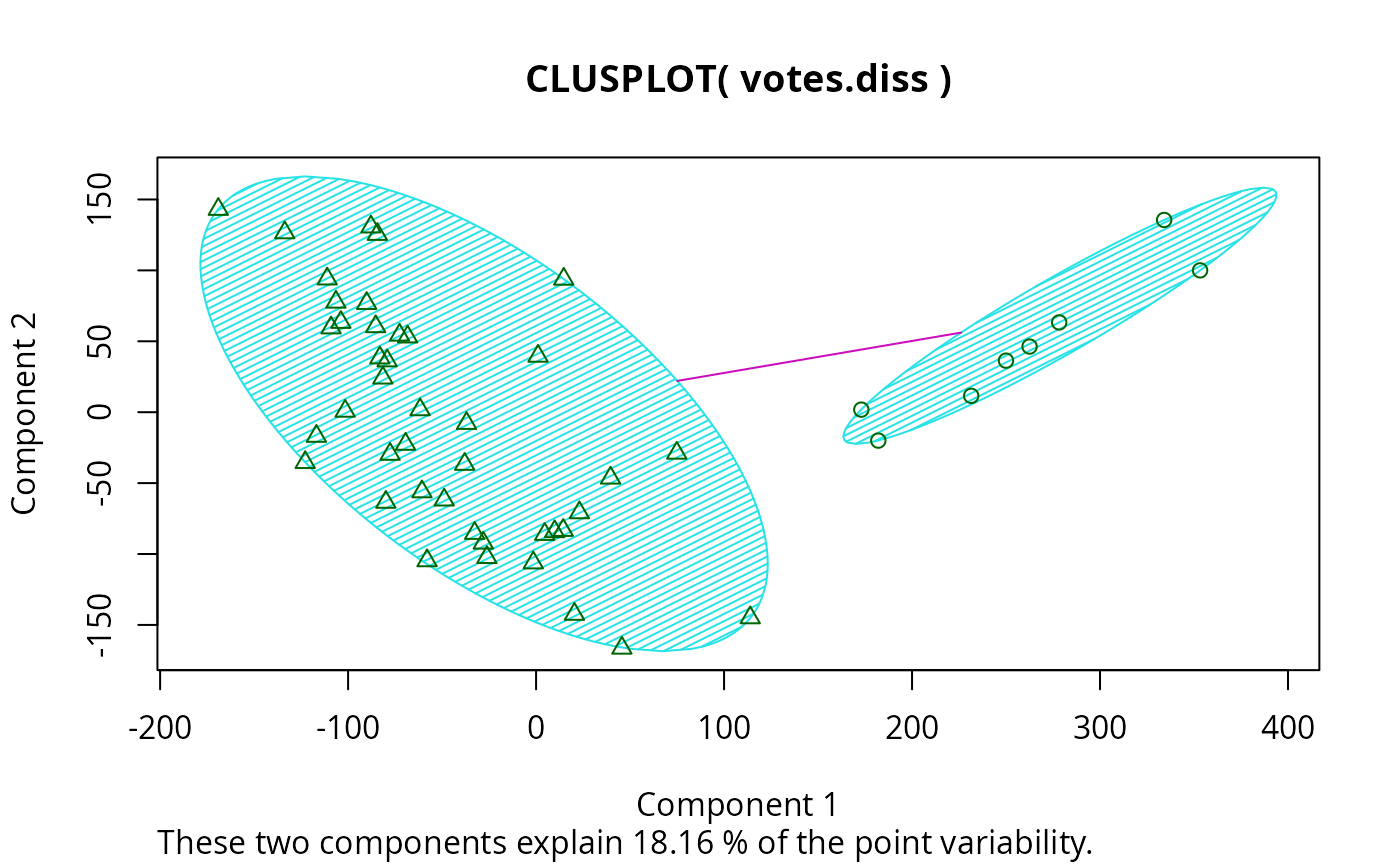clusplot(votes.diss, votes.clus, diss = TRUE, shade = TRUE)