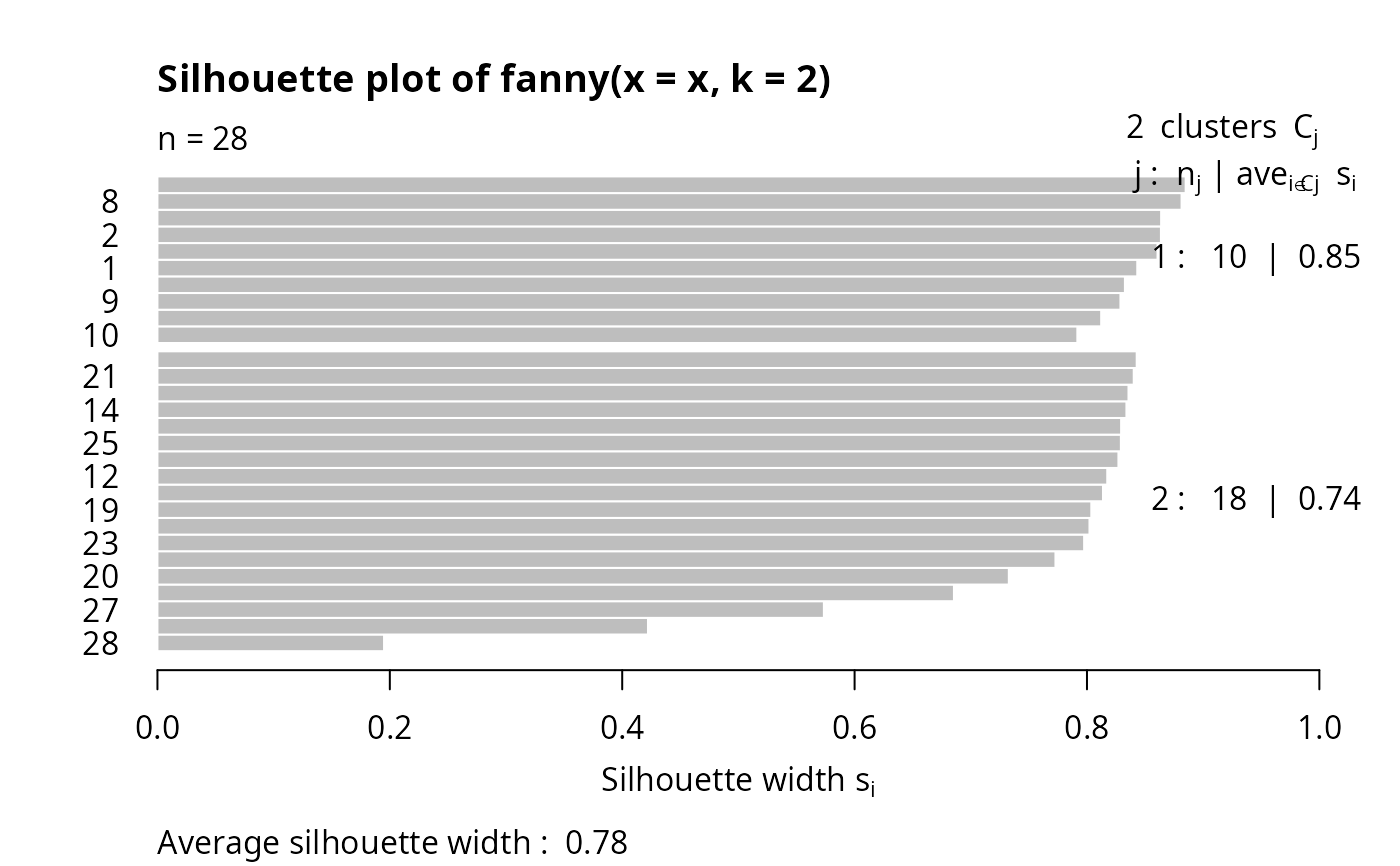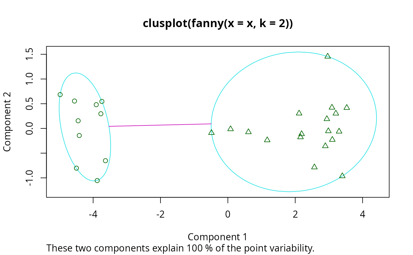 (fan.x.15 <- fanny(x, 2, memb.exp = 1.5)) # 'crispier' for obs. 26:28