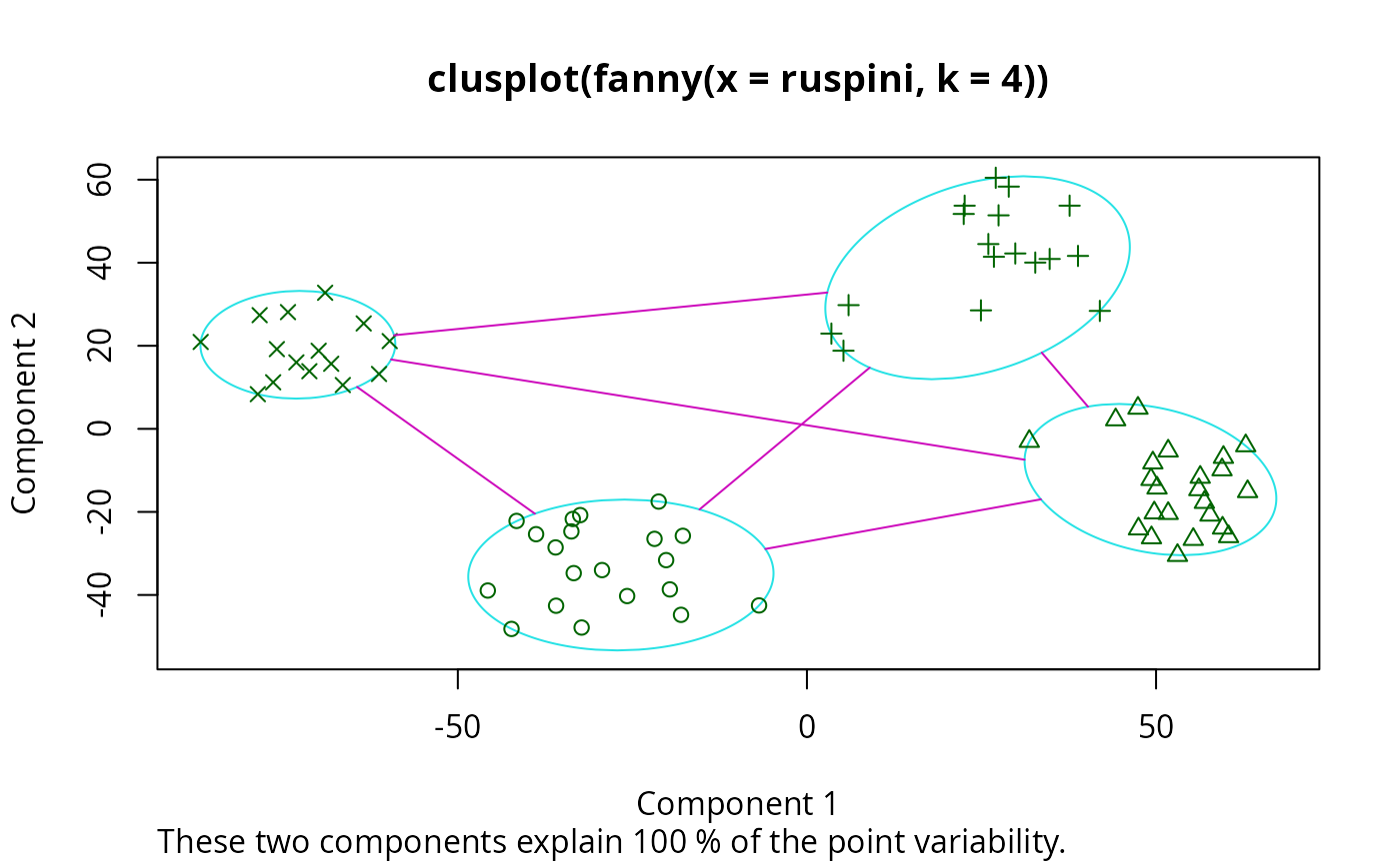 (fanny(x, 2, memb.exp = 3)) # more fuzzy in general