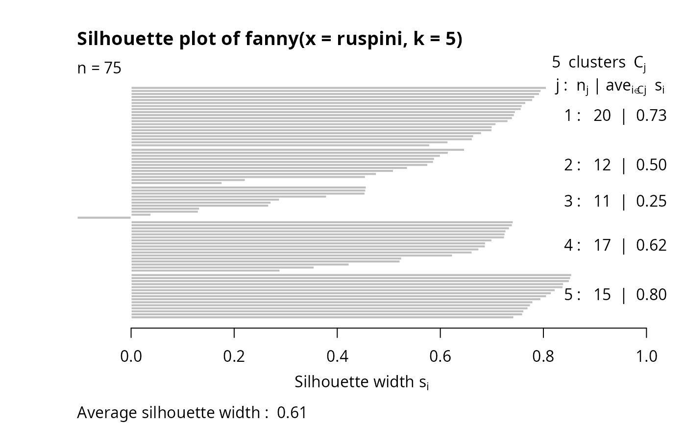 In a fuzzy clustering, each observation is “spread out” over the various clusters. Denote by \(u_{iv}\) the membership of observation \(i\) to cluster \(v\).