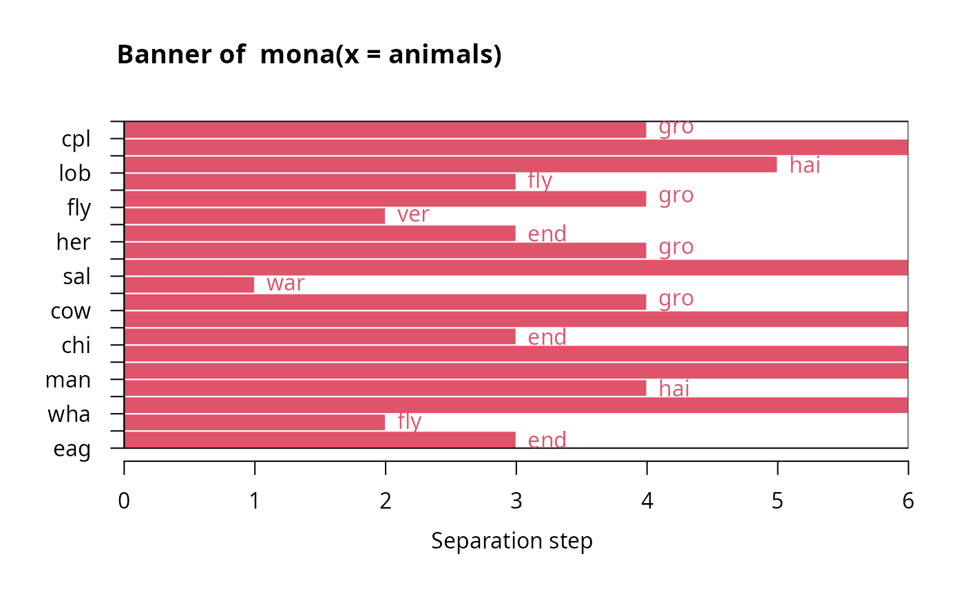 mona.RdReturns a list representing a divisive hierarchical clustering of a dataset with binary variables only.