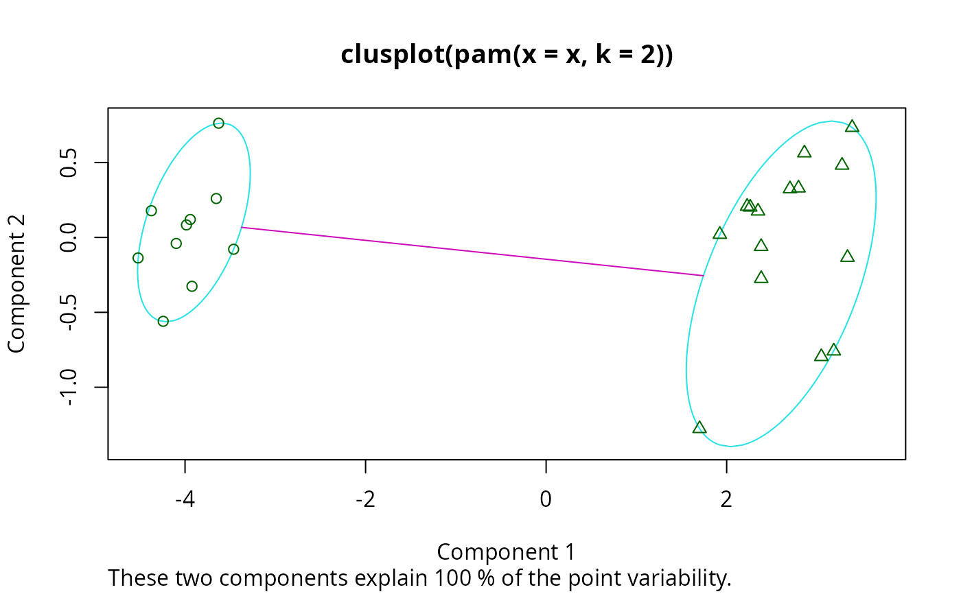 p2.s <- pam(x, 2, medoids = c(1,16), do.swap = FALSE)
