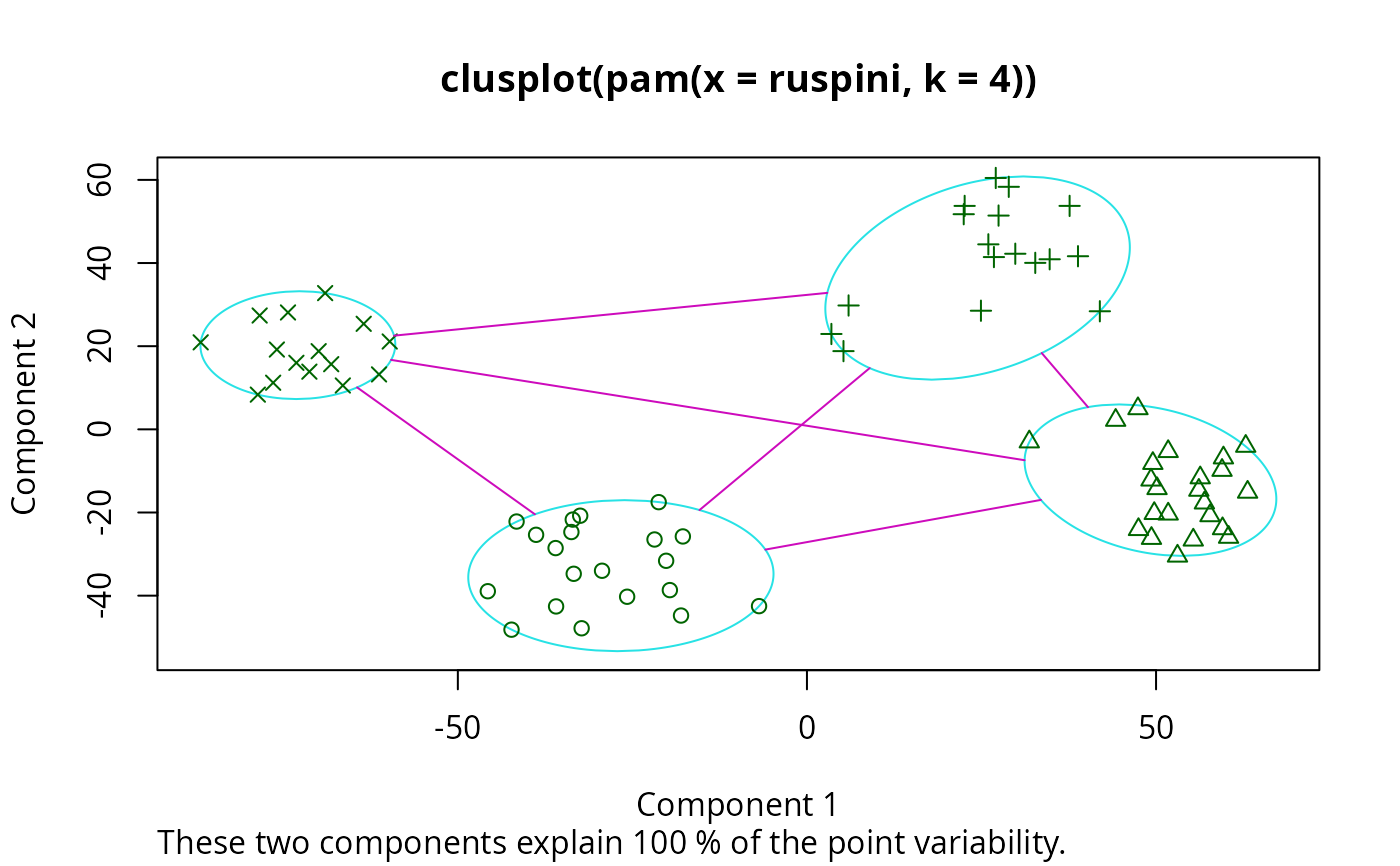 xis typically the output ofdaisyordist. Also a vector of length n*(n-1)/2 is allowed (where n is the number of observations), and will be interpreted in the same way as the output of the above-mentioned functions. Missing values (NAs) are not allowed.- k