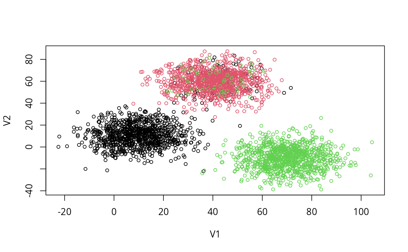 plot(xclara, cex = 3/4, col = rep(1:3, each=1000))