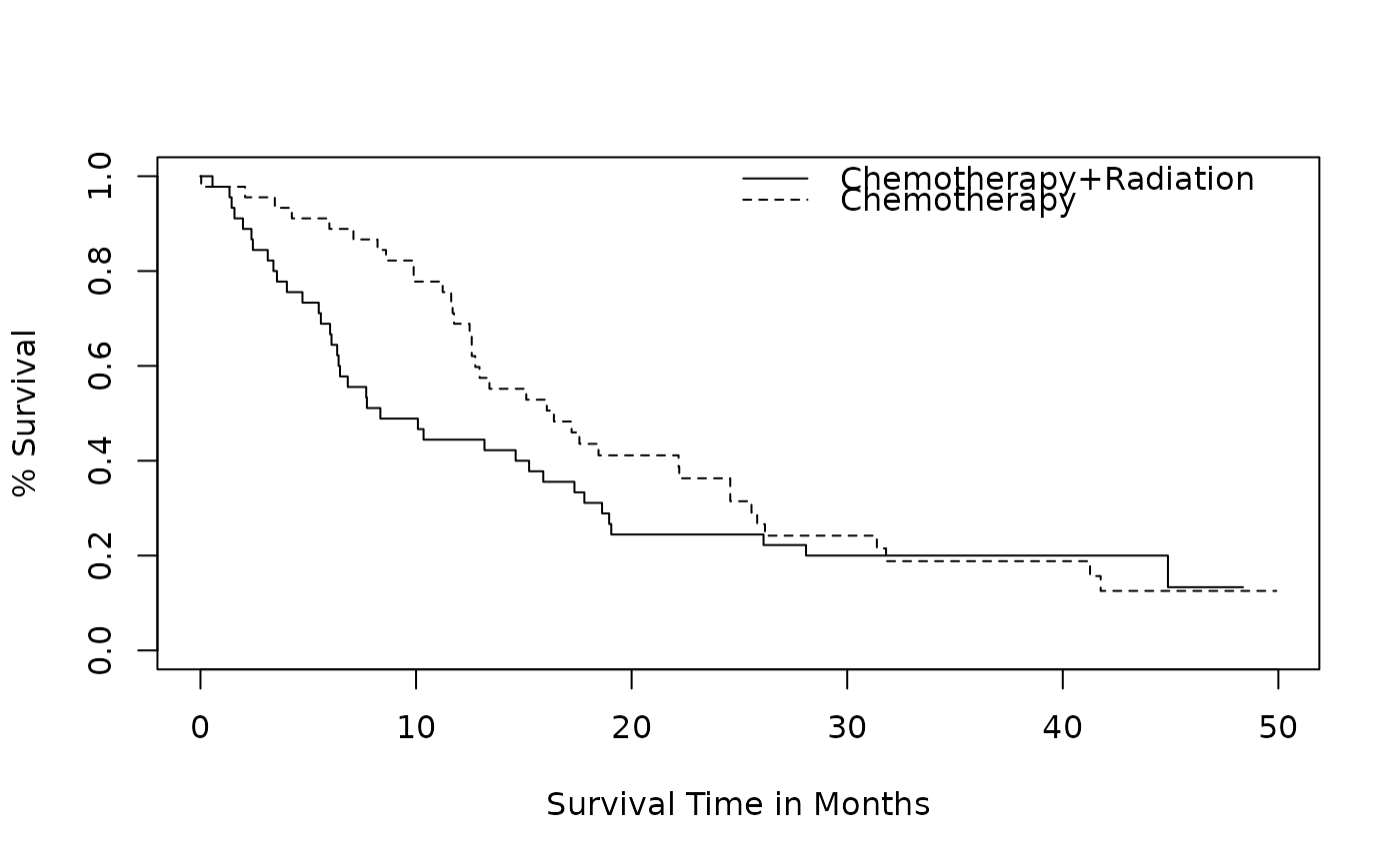 c("Chemotherapy+Radiation", "Chemotherapy"), bty = "n")
