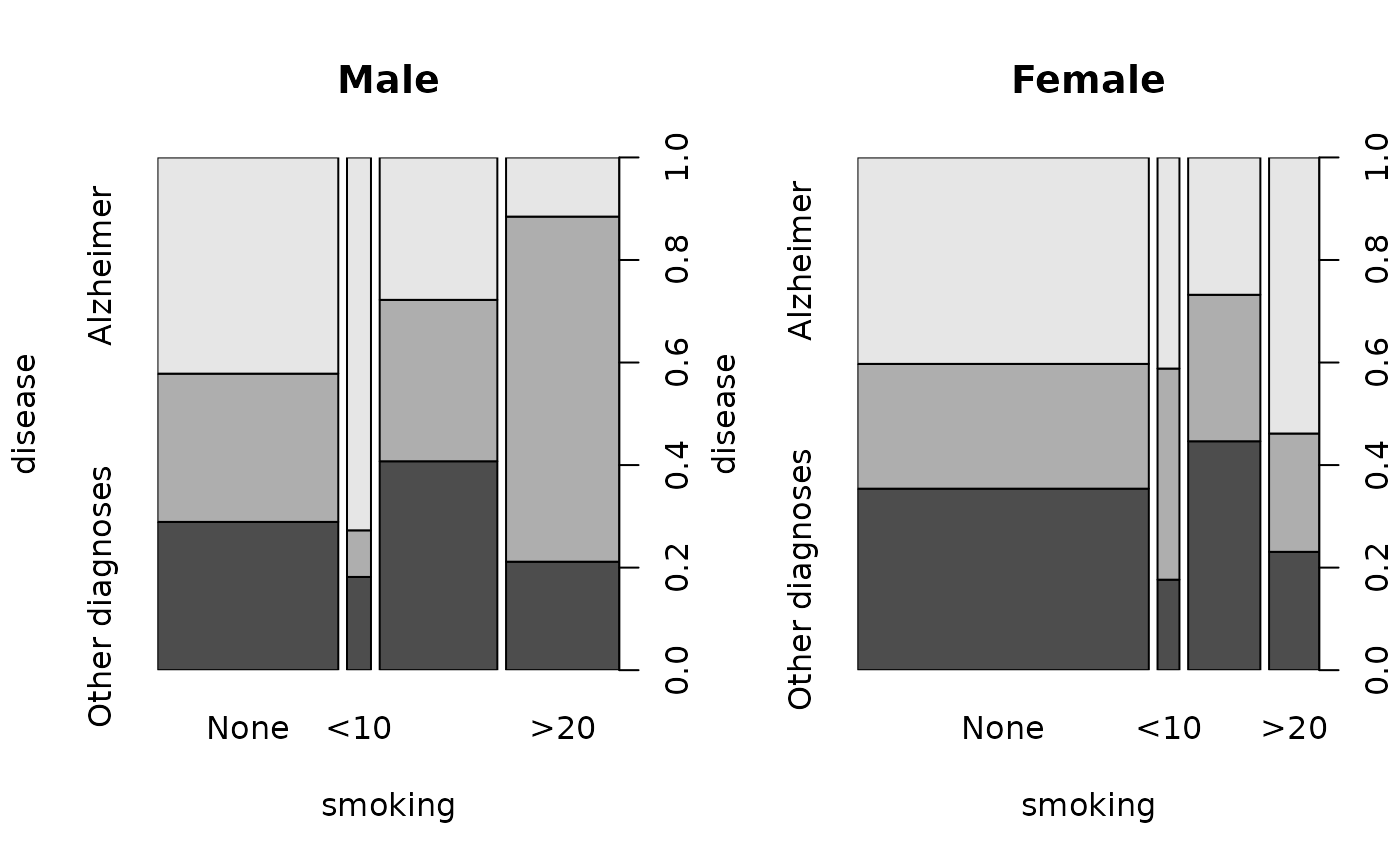 spineplot(disease ~ smoking, data = alzheimer,