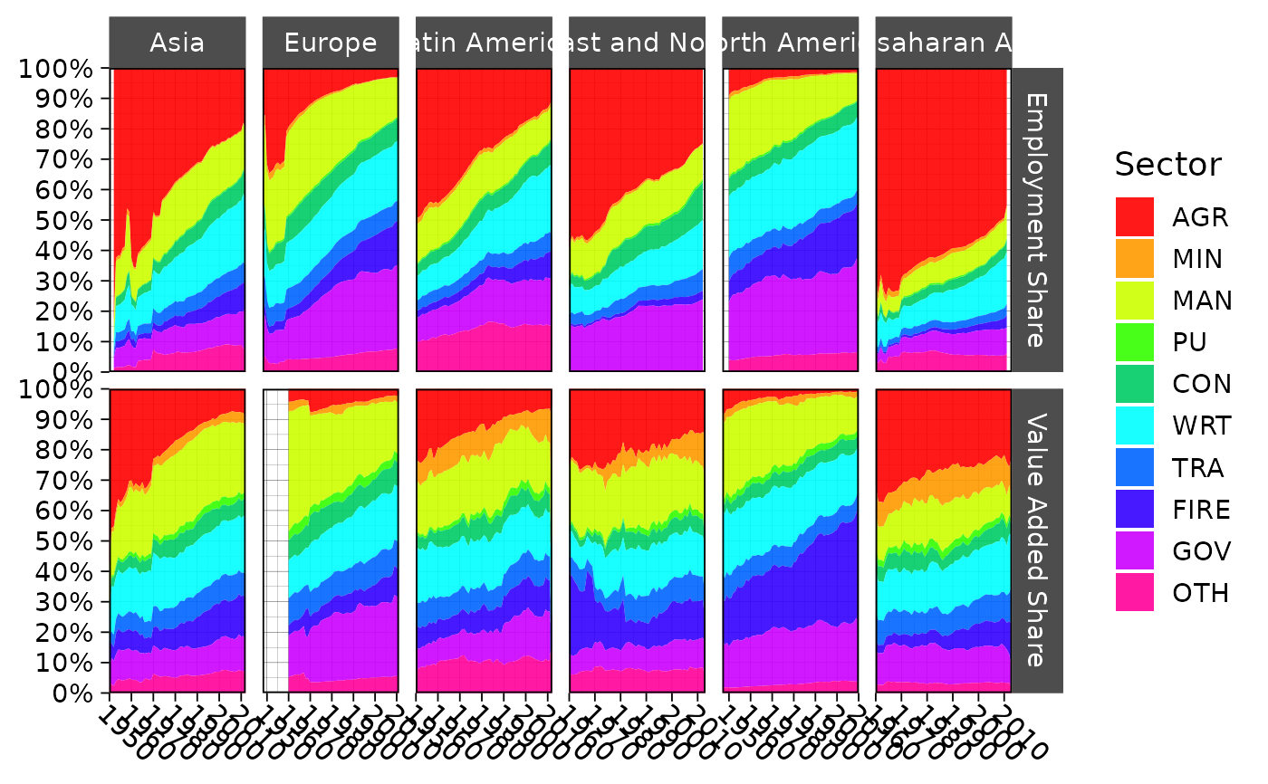 GGDC10S.RdThe GGDC 10-Sector Database provides a long-run internationally comparable dataset on sectoral productivity performance in Africa, Asia, and Latin America. Variables covered in the data set are annual series of value added (in local currency), and persons employed for 10 broad sectors.