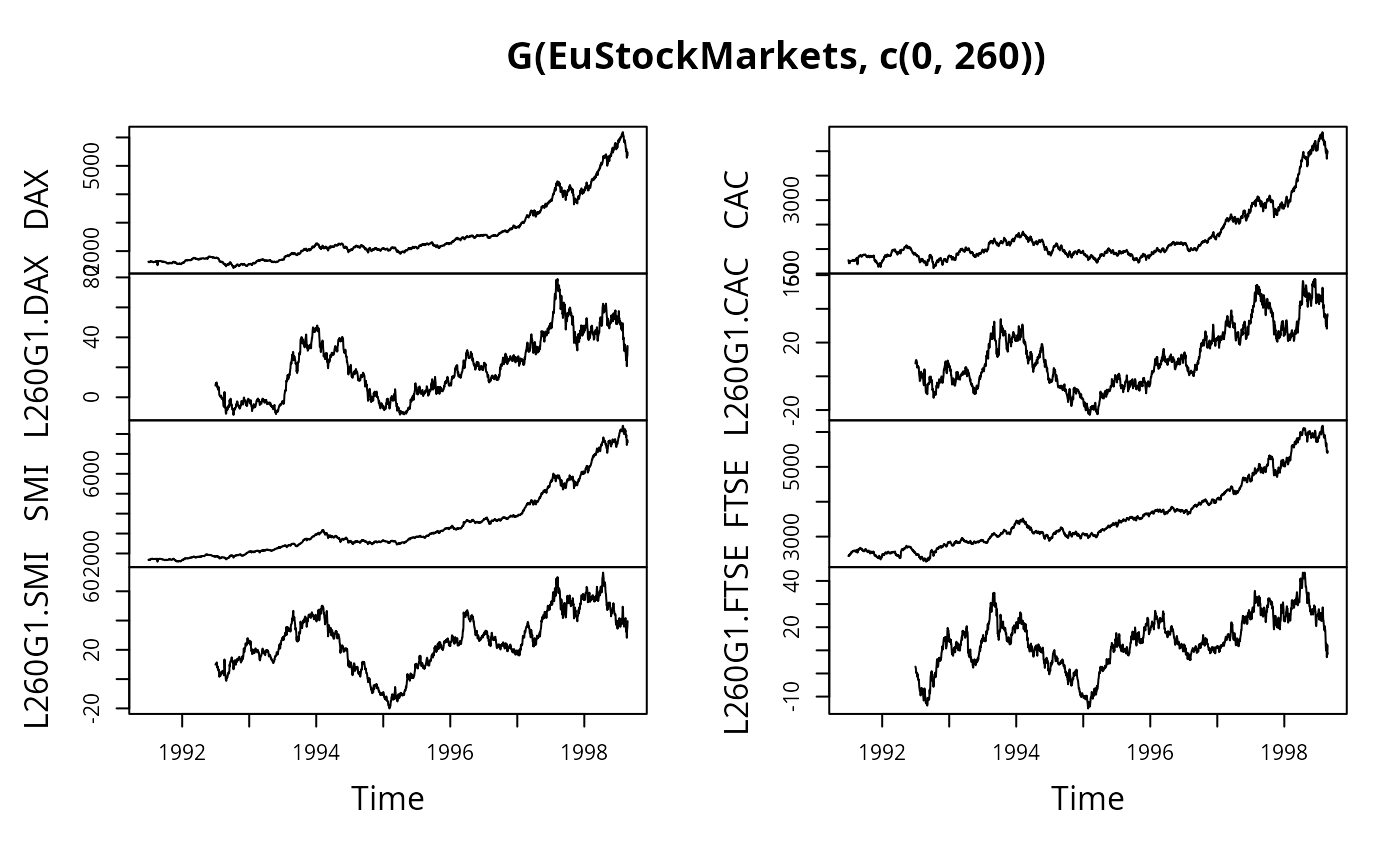 plot(G(EuStockMarkets,c(0,260))) # Plot series and annual growth rates