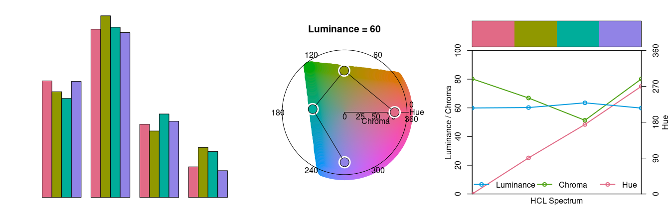 The bar plot is used as a typical application for a qualitative palette (in addition to the time series and density plots used above). The other two displays show that luminance is (almost) constant in the palette while the hue changes linearly along the color “wheel”. Ideally, chroma would have also been constant to completely balance the colors. However, at this luminance the maximum chroma differs across hues so that the palette is fixed up to use less chroma for the yellow and green elements.