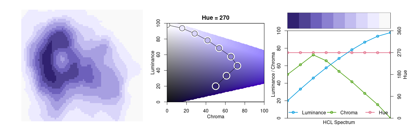 The other two displays show that hue is constant in the palette while luminance and chroma vary. Luminance increases monotonically from dark to light (as required for a proper sequential palette). Chroma is triangular-shaped which allows the viewer to better distinguish the middle colors in the palette when compared to a monotonic chroma trajectory.
