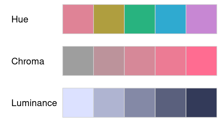luminance for qualitative palettes and the hue for sequential/diverging