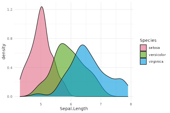 ggplot(iris, aes(x = Sepal.Length, fill = Species)) + geom_density(alpha = 0.6) +