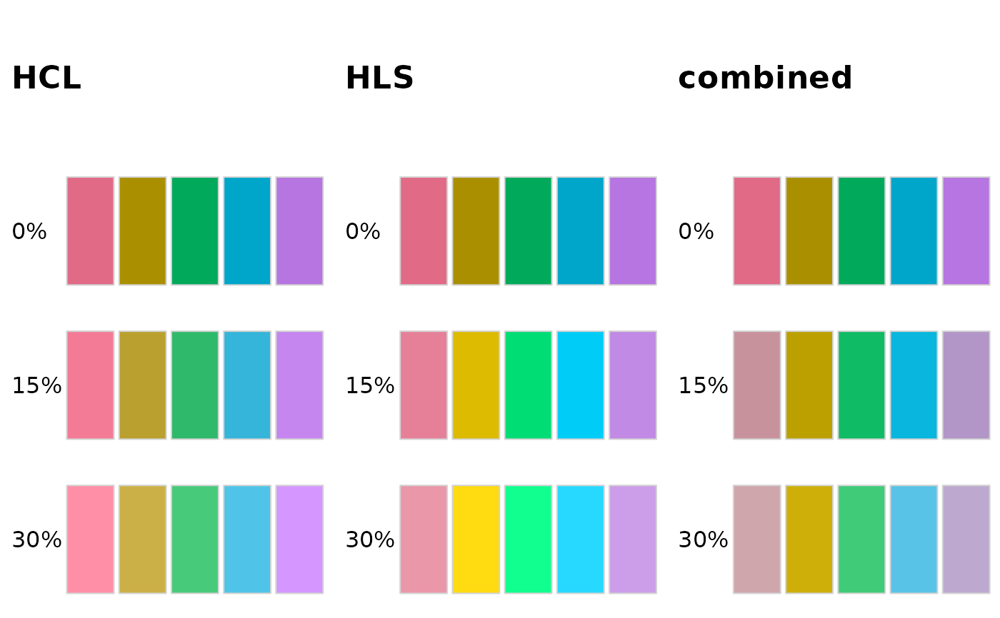the adjusted HLS colors are converted into HCL, and then the chroma components of the adjusted HLS