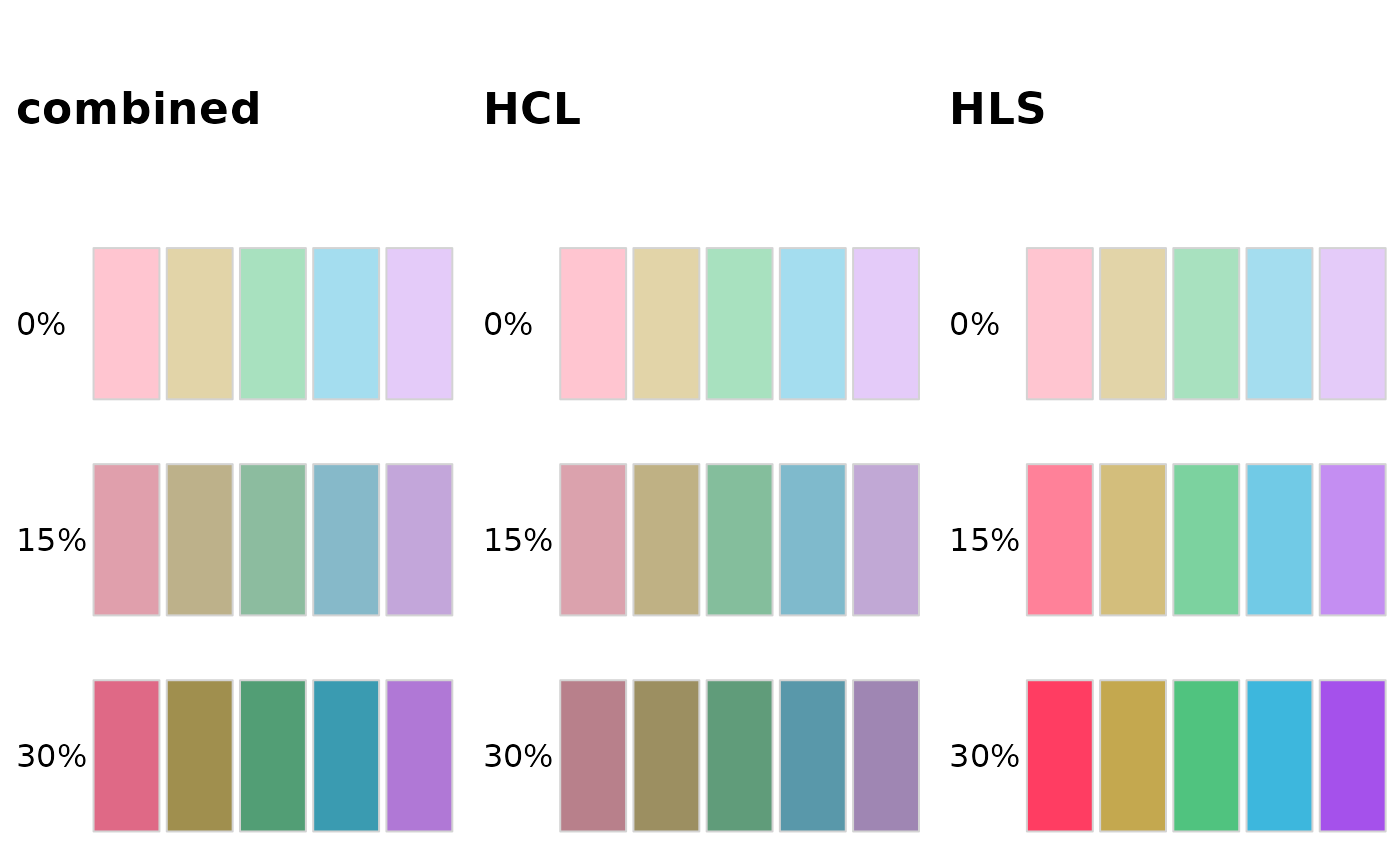 If space = "combined", the colors are first adjusted in both the HCL and HLS spaces. Then,