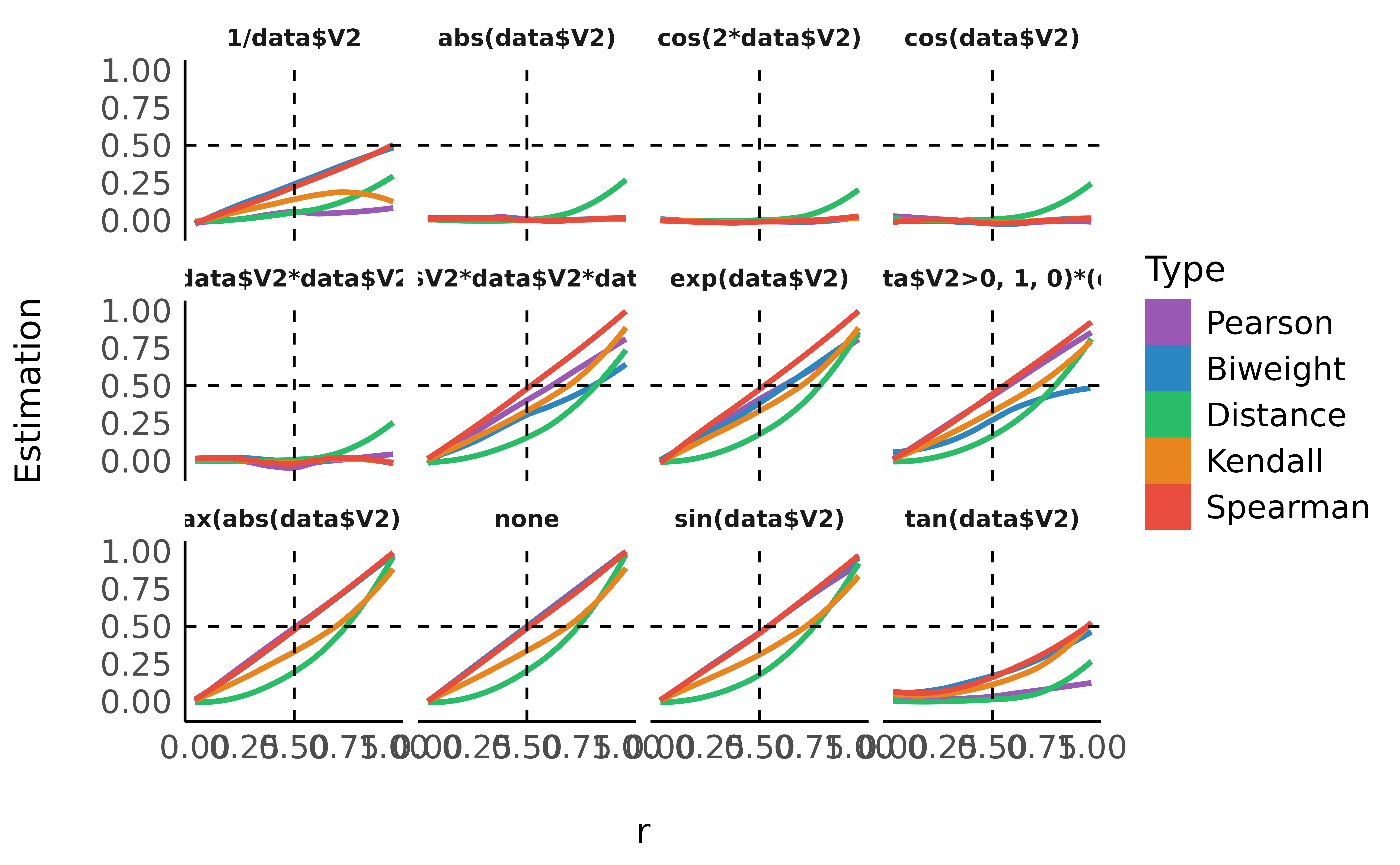 mutate(Type = relevel(as.factor(Type), "Pearson", "Spearman", "Kendall", "Biweight", "Distance")) %>%