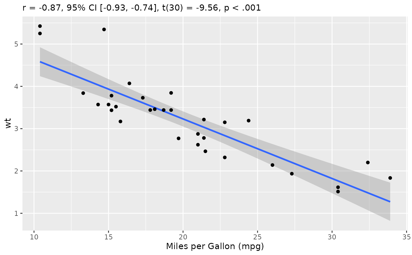 #> subtitle = 'r = -0.87, 95% CI [-0.93, -0.74], t(30) = -9.56, p < .001'