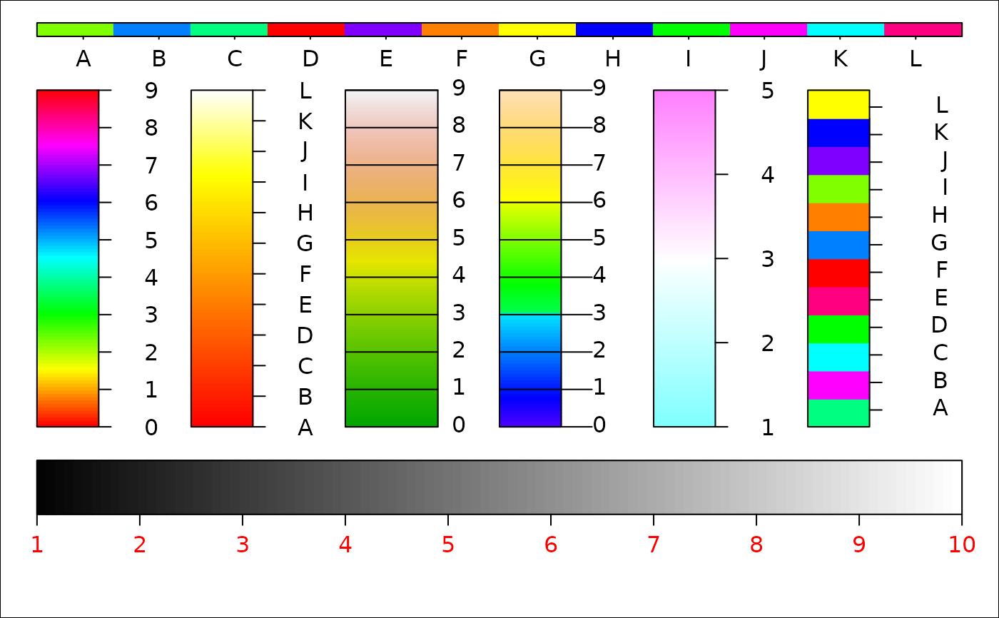 colorlegend(sample(rainbow(12)), labels = LETTERS[1:12],