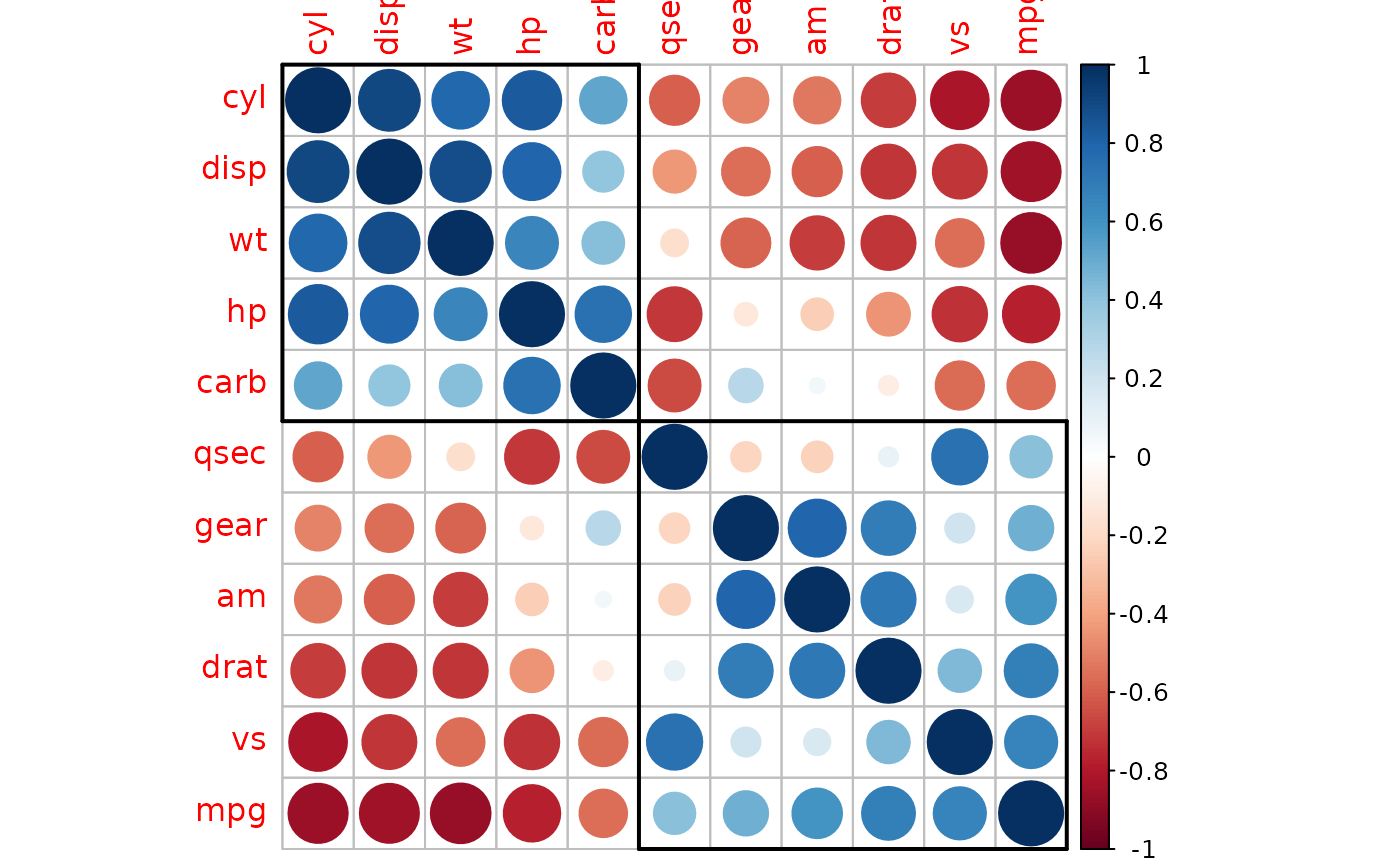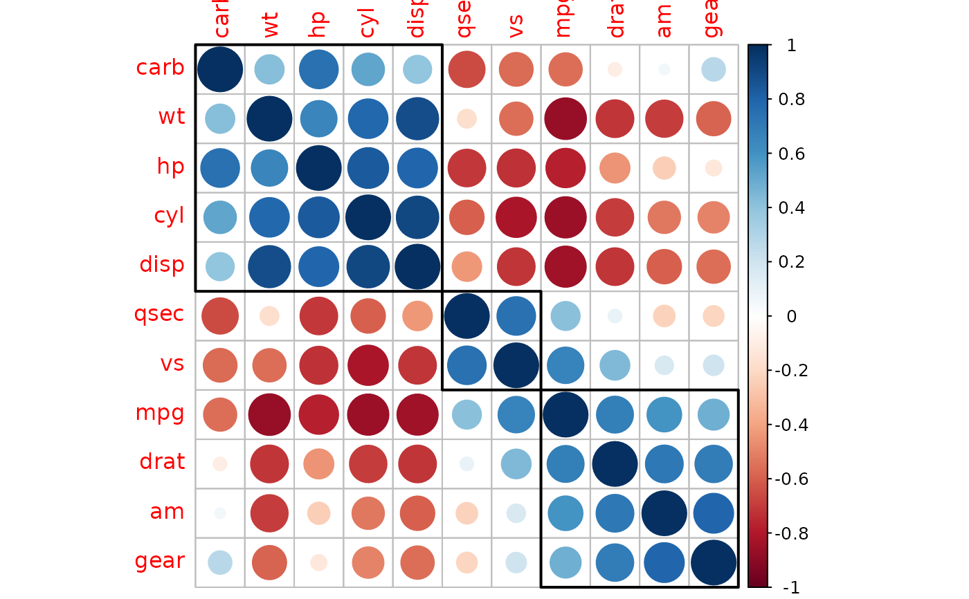 corrplot(M, order = 'FPC') |> corrRect(index = c(1, 6, 11))
