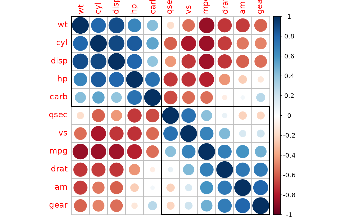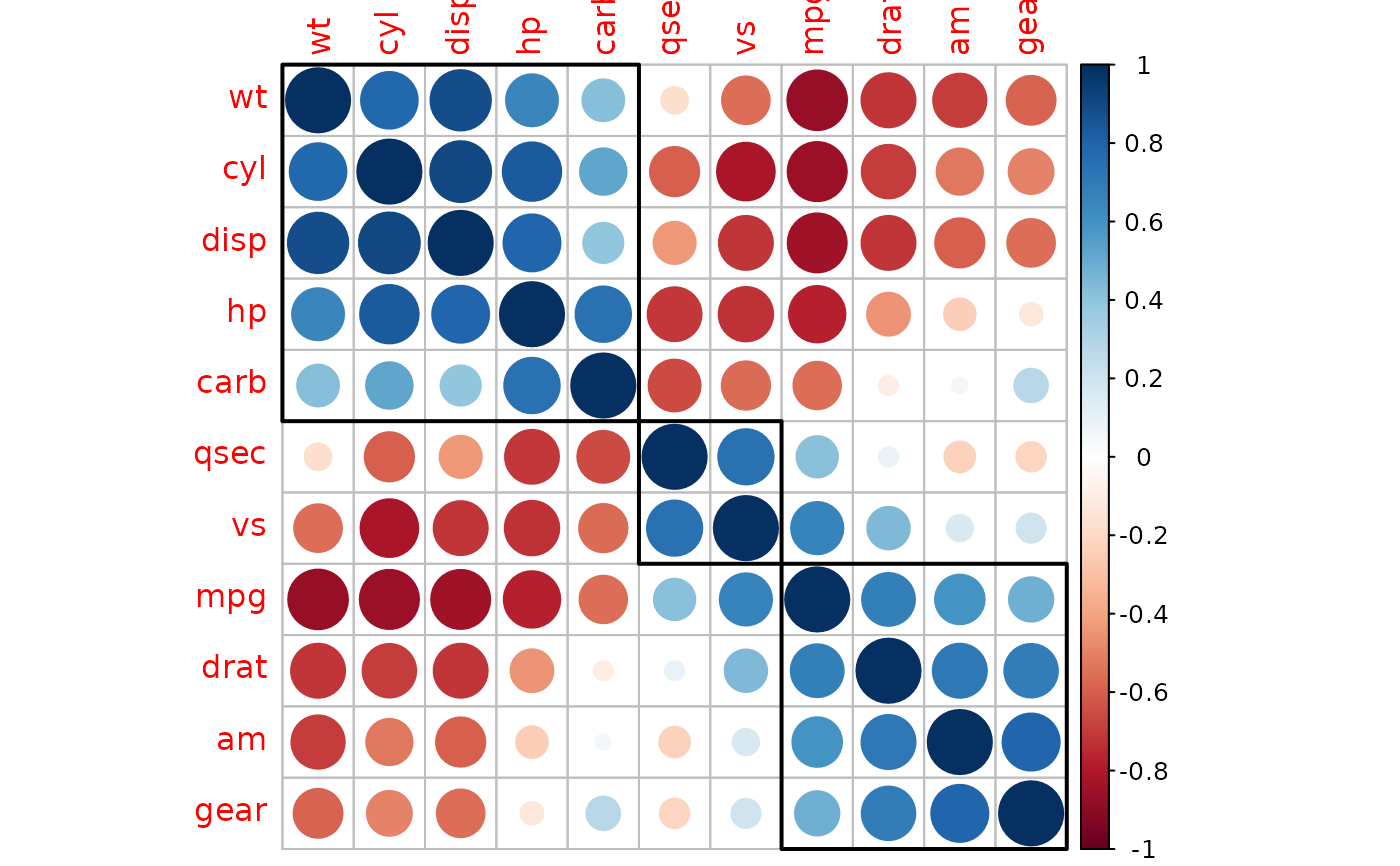 # same as: corrplot(M, order = 'hclust', addrect = 2)