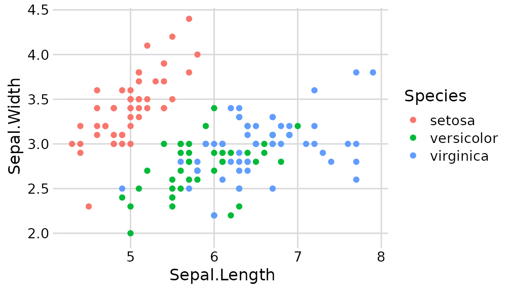 ggplot(iris, aes(Sepal.Length, Sepal.Width, color = Species)) +