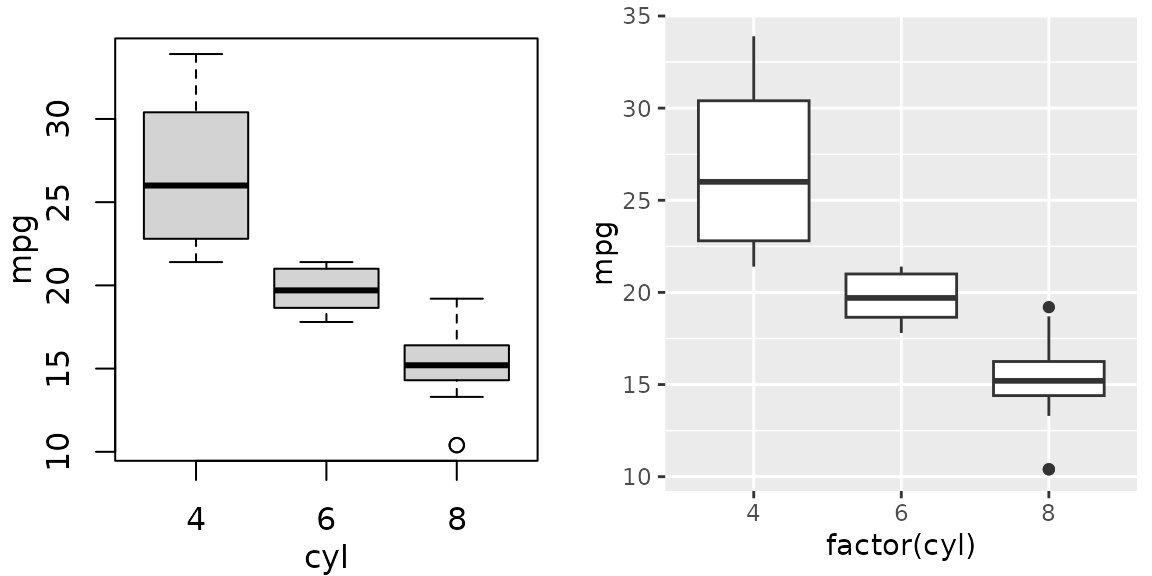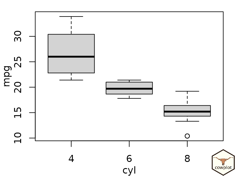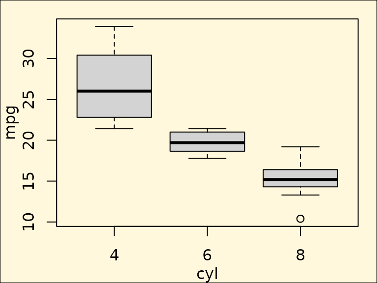 boxplot(mpg ~ cyl, xlab = "cyl", ylab = "mpg", data = mtcars)